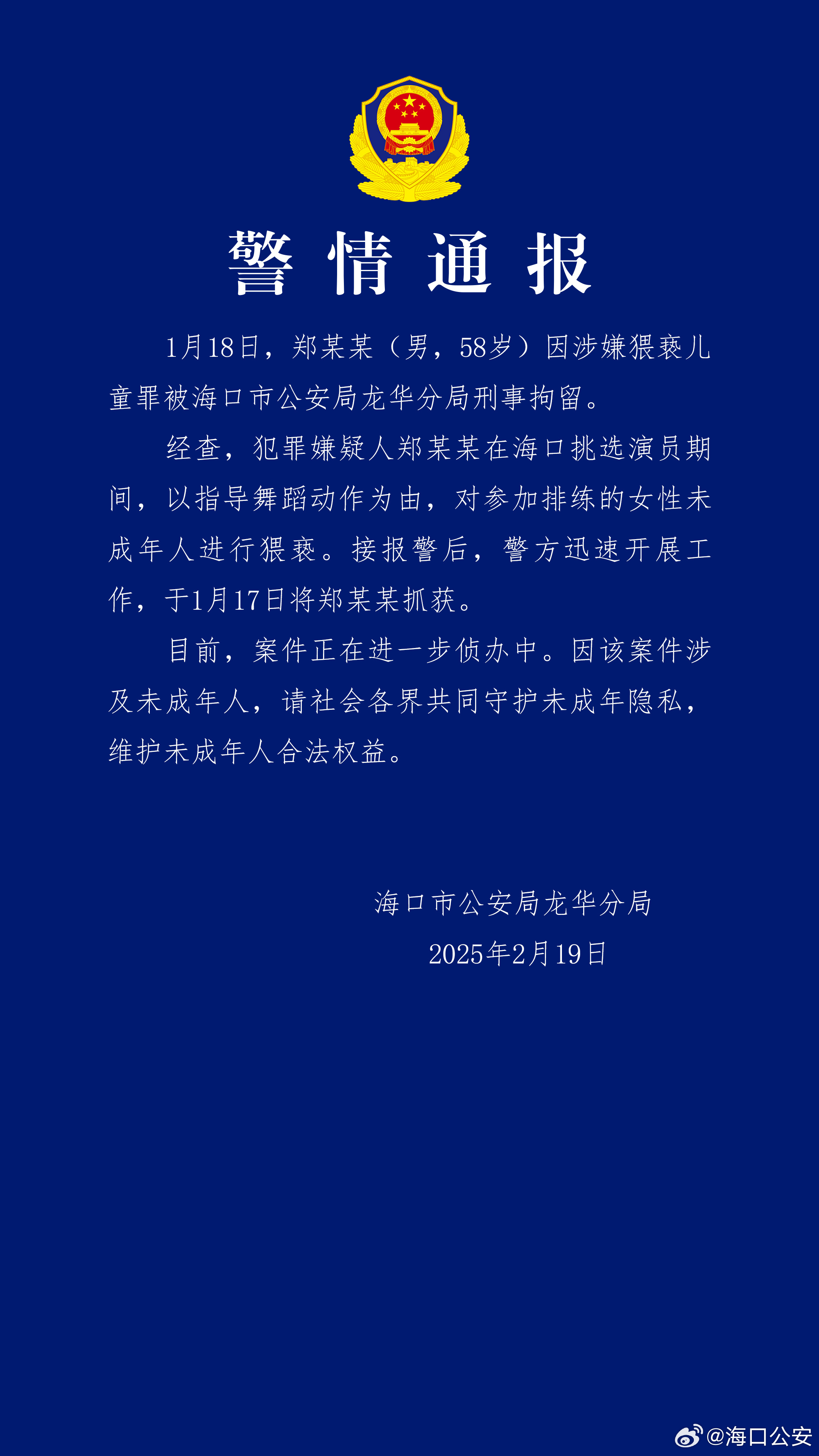 經查,犯罪嫌疑人鄭某某在海口挑選演員期間,以指導舞蹈動作為由,對參加排練的女性未成年人進行猥褻。接報警後,警方迅速開展工作,於1月17日將鄭某某抓獲。目前,案件正在進一步偵辦中。