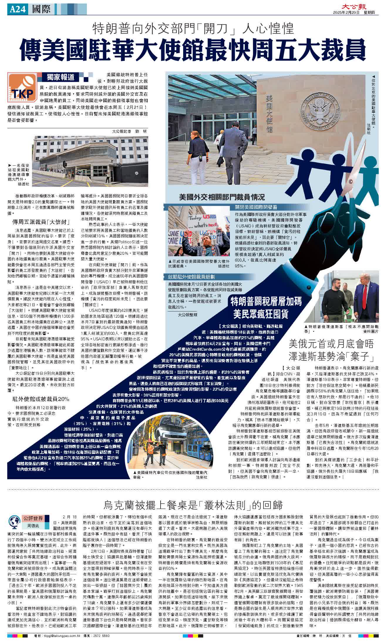 (大公報記者 劉 明)美國總統特朗普上任後,對聯邦政府進行大裁員。近日有消息稱美國駐華大使館已於上周接到美國國務院的裁員通知,要求同時削減外派的美國外交官及在中國聘用的員工。同時美國在中國的幾個領事館也會相應裁撤人員。該消息稱,美國駐華大使館最快會在本周五(2月21日)發信通知被裁員工,使領館人心惶惶。目前暫未知美國駐港澳總領事館是否會受影響。