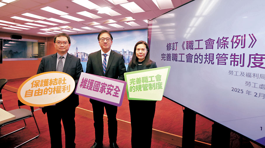 (香港文匯報 記者 黃子晉)香港特區政府計劃今年4月向立法會提交修訂《職工會條例》的條例草案,以加強維護國家安全及完善職工會的規管制度。根據勞工及福利局和勞工處昨日向立法會提交文件介紹的修訂建議,新修訂包括職工會登記局局長可基於維護國家安全的需要拒絕職工會的新登記或合併申請等(見表)。勞工處副處長(勞工事務行政)何錦標昨日在傳媒簡報會上表示,特區政府的修訂建議針對性地加強維護國家安全,已顧及市民組織和參與職工會的自由和權利,對合法合規職工會的運作一定不會構成負面影響,促進職工會的健康發展。