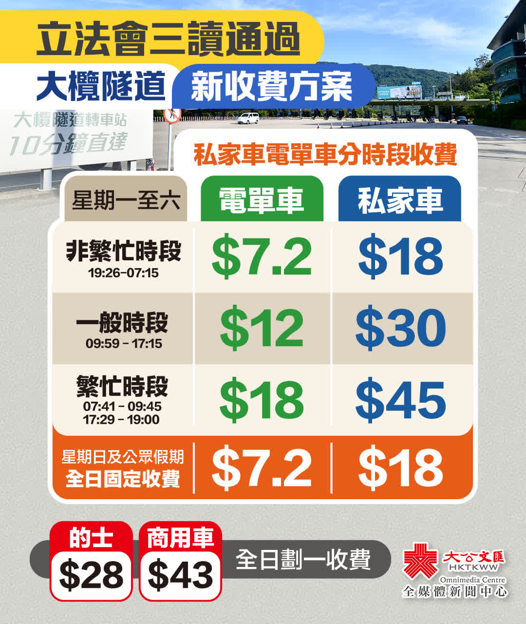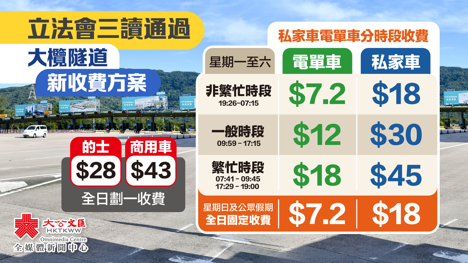 大公文匯全媒體報道,立法會今日(20日)三讀通過《2024年行車隧道(政府)(修訂)條例草案》,訂定大欖隧道新收費方案,其中私家車繁忙時段收45元、一般時段收30元、非繁忙時間收18元,的士全日收28元,貨車和巴士等商用車全日收43元。出席的84名立法會議員當中,有82票贊成,1票棄權。
