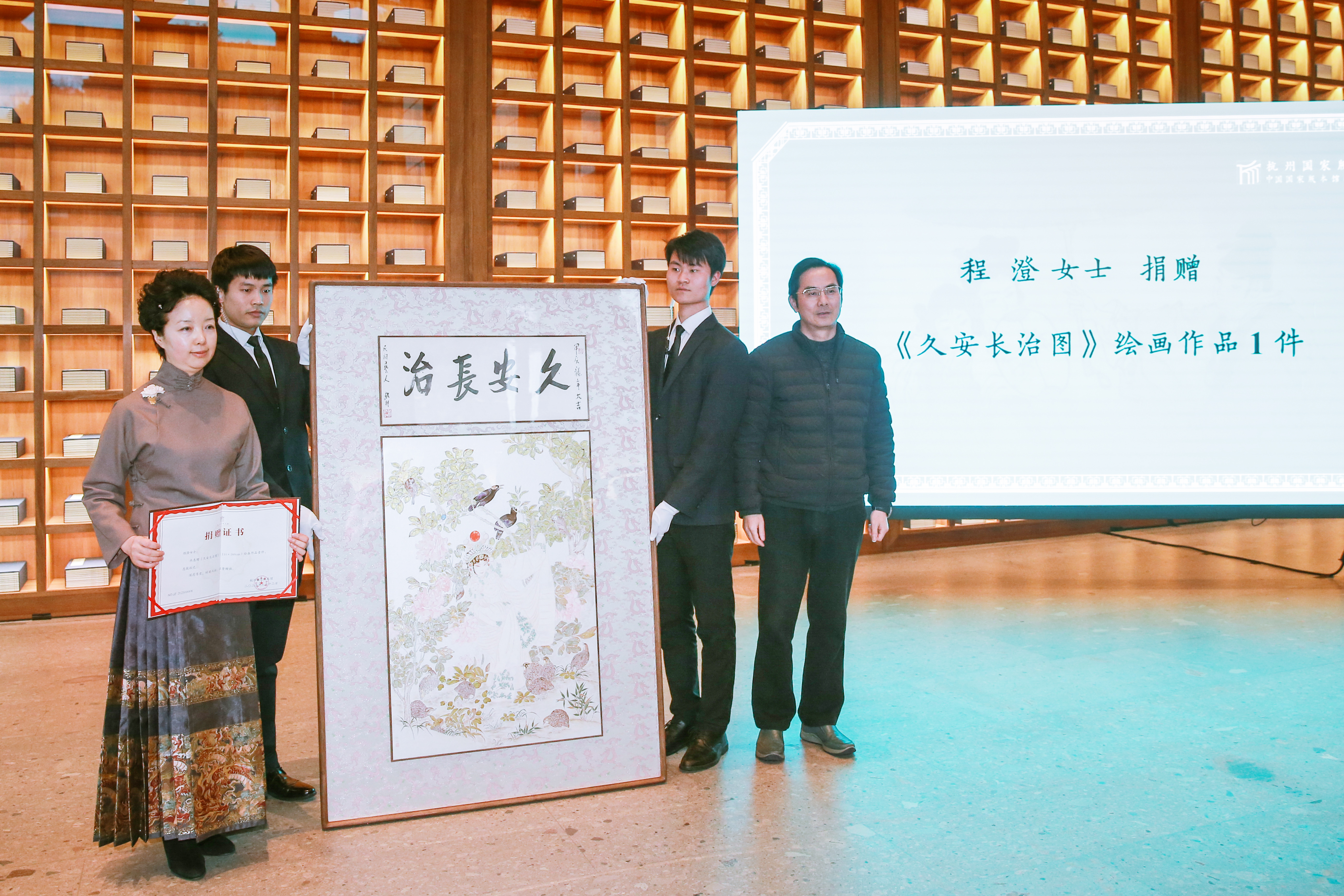 發布會上,程澄將新近精心繪製的《久安長治圖·白娘子》捐贈予杭州國家版本館。圖中白娘子溫婉柔美,牡丹、桂花等名花異卉寓意富貴祥瑞、前程錦繡,九隻鵪鶉則諧音「久安」,全圖充分表露出對於偉大祖國長治久安、物阜民豐的美好期盼和溫馨禱祝,既表達出對恩師的敬重與追隨之意,亦生動展現出中國式現代化所呈現出的輝煌與璀璨。