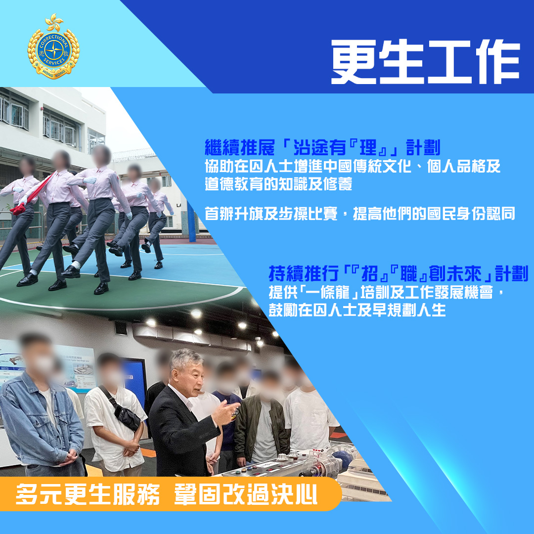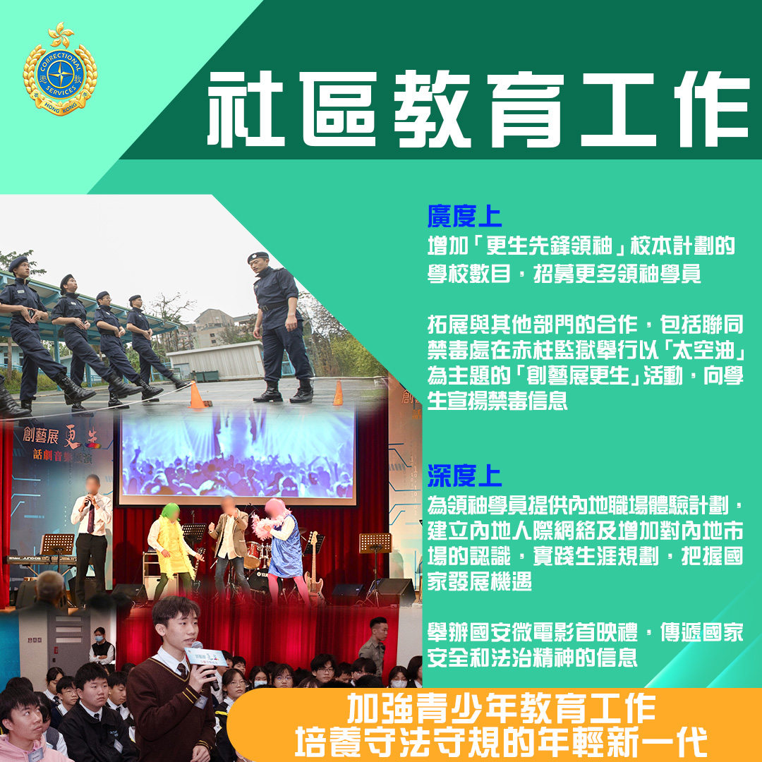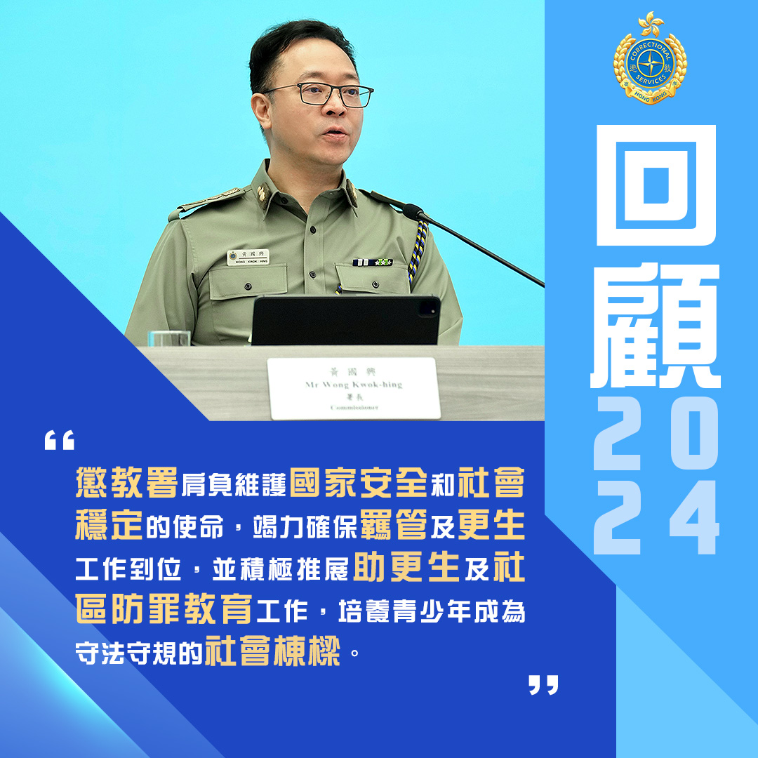 過去一年,《維護國家安全條例》刊憲生效,懲教署堅定不移地肩負維護國家安全及社會穩定的使命,竭力確保羈管及更生工作到位。與此同時,署方更主動走到圍牆外,利用懲教署的獨有資源,積極推展助更生及社區防罪教育工作,培養青少年成為守法守規的社會棟樑。