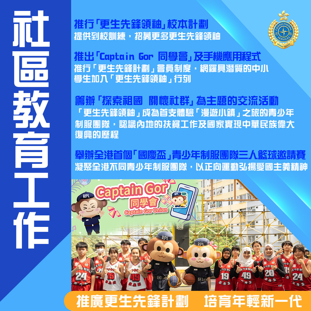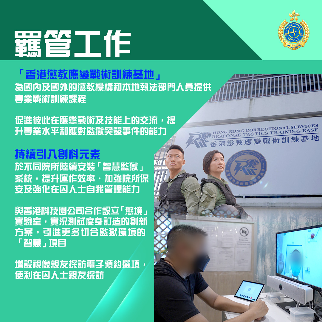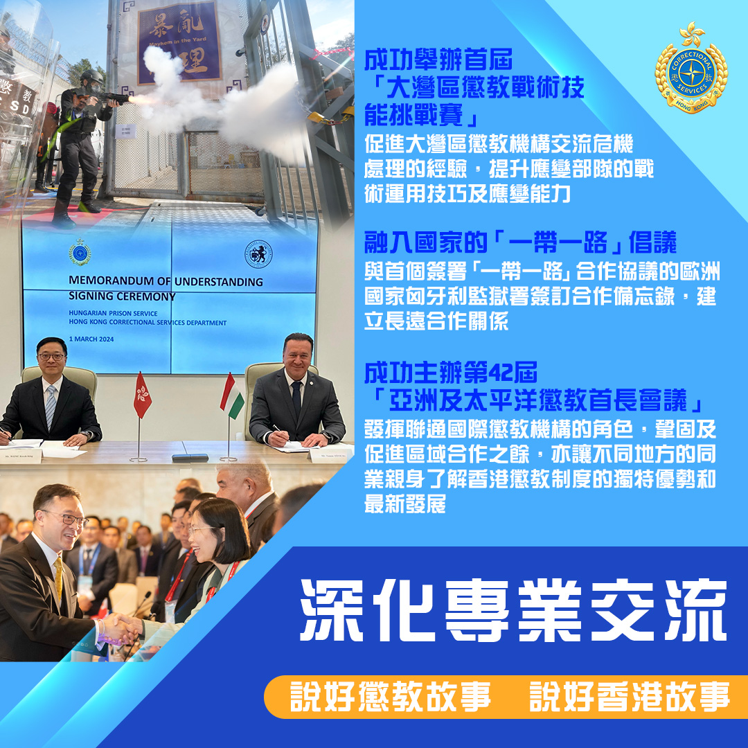 過去一年,《維護國家安全條例》刊憲生效,懲教署堅定不移地肩負維護國家安全及社會穩定的使命,竭力確保羈管及更生工作到位。與此同時,署方更主動走到圍牆外,利用懲教署的獨有資源,積極推展助更生及社區防罪教育工作,培養青少年成為守法守規的社會棟樑。