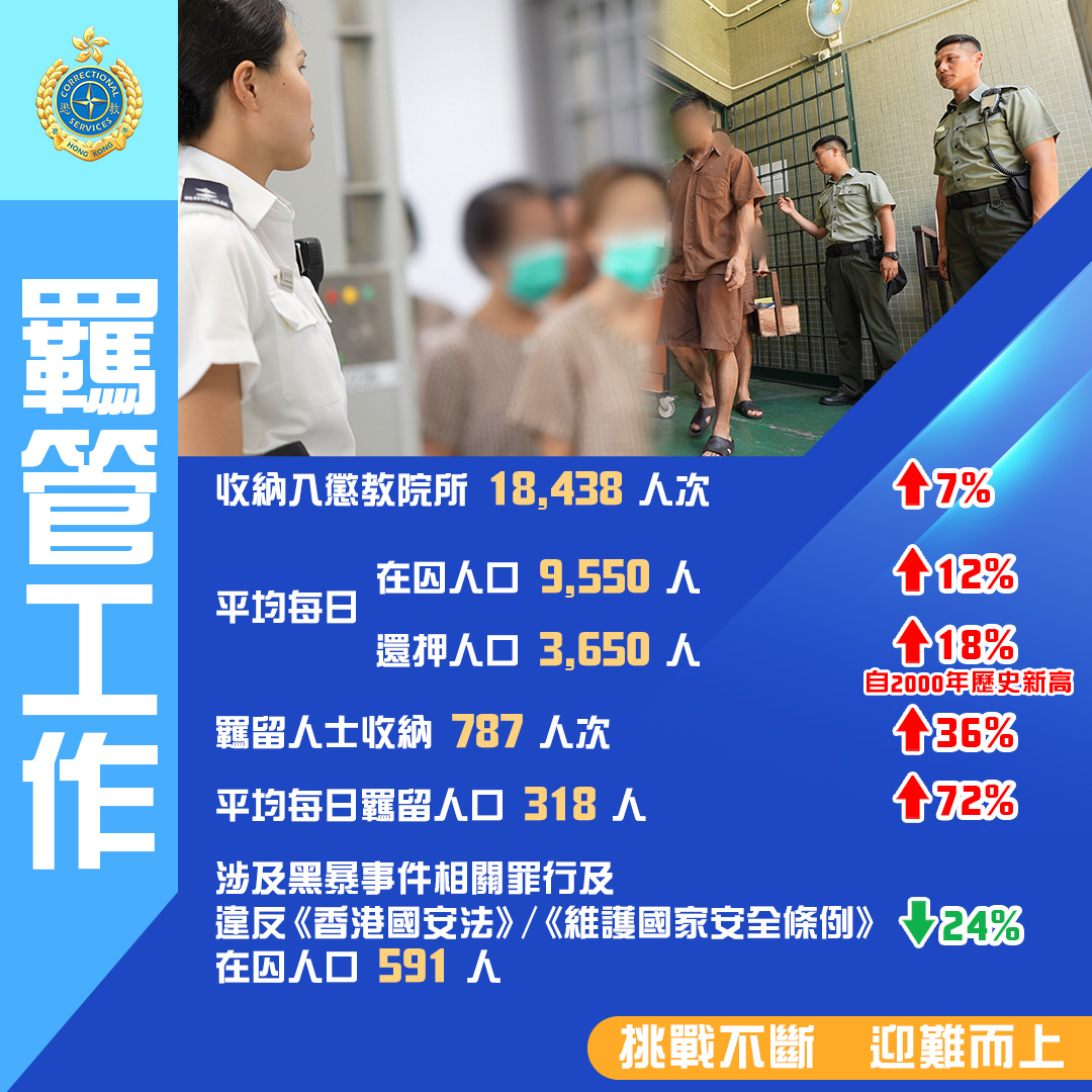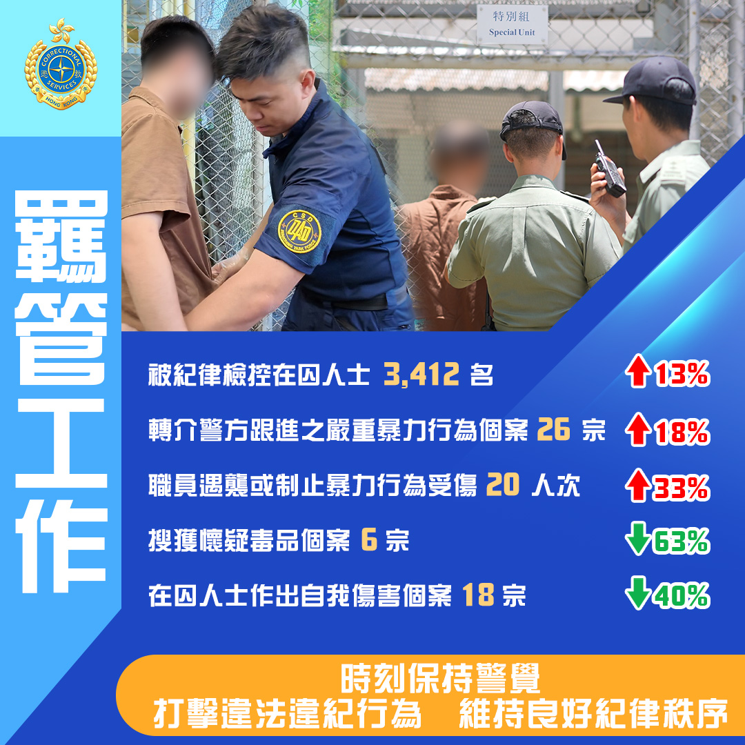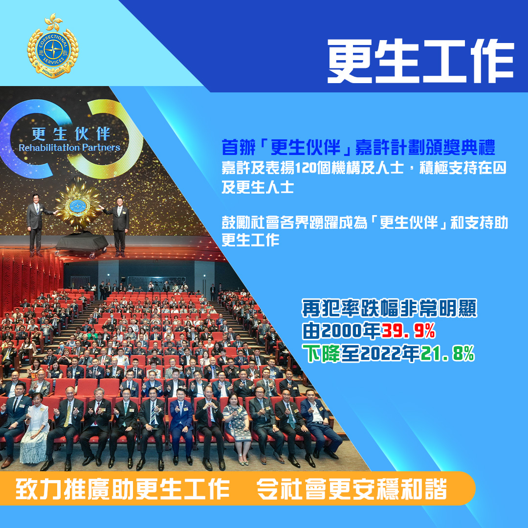 儘管在囚人口變化帶來不少挑戰,但有賴懲教署上下一心,靈活應變,去年各個工作範疇均有長足發展,香港的再犯率更由2000年的39.9%下降至2022年的21.8%,成果斐然。