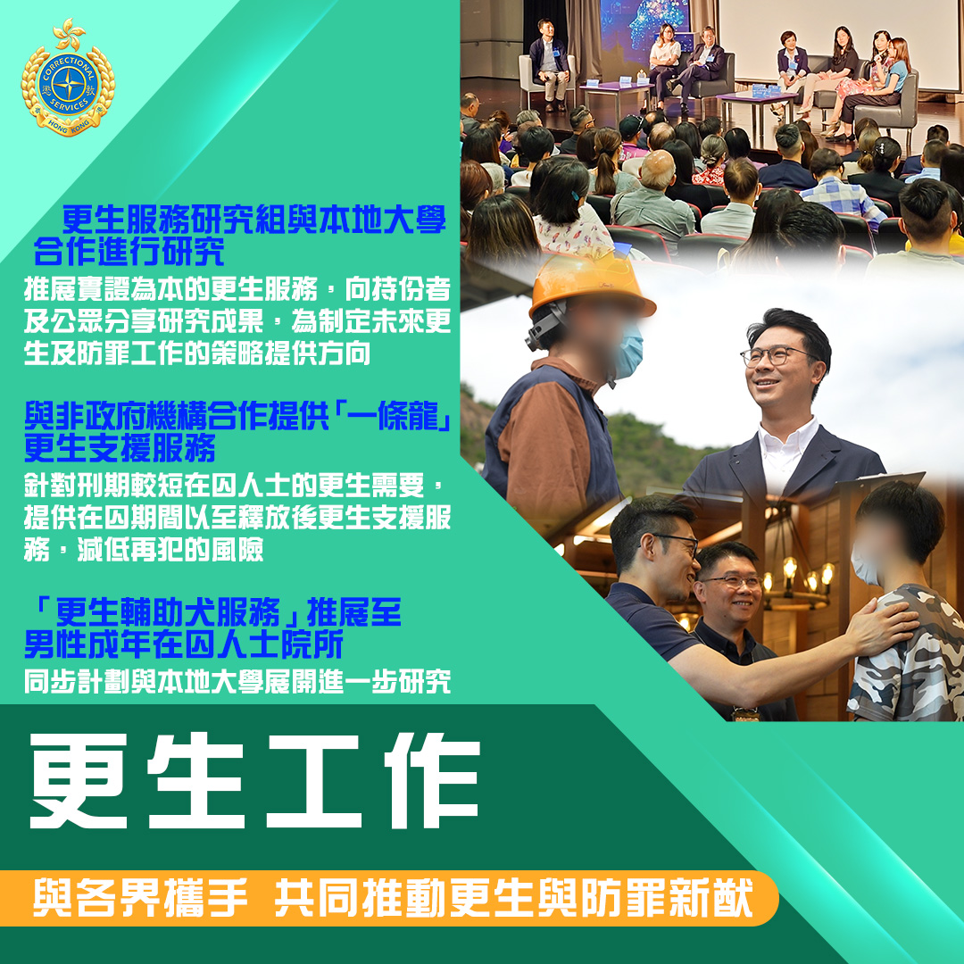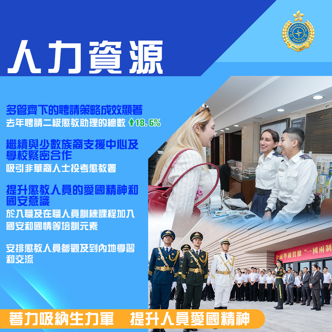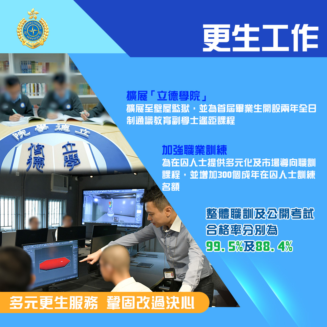 儘管在囚人口變化帶來不少挑戰,但有賴懲教署上下一心,靈活應變,去年各個工作範疇均有長足發展,香港的再犯率更由2000年的39.9%下降至2022年的21.8%,成果斐然。