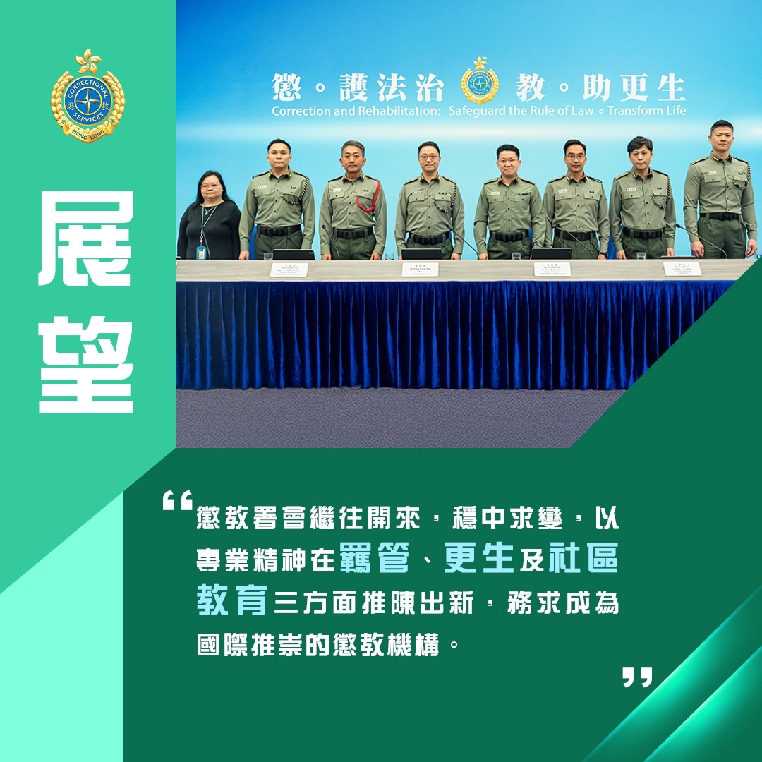 署長黃國興在記者會上亦分享了來年各個範疇的工作重點,並強調懲教署會繼往開來,穩中求變,以專業精神繼續於羈管、更生及社區教育三方面推陳出新,務求成為國際推崇的懲教機構。