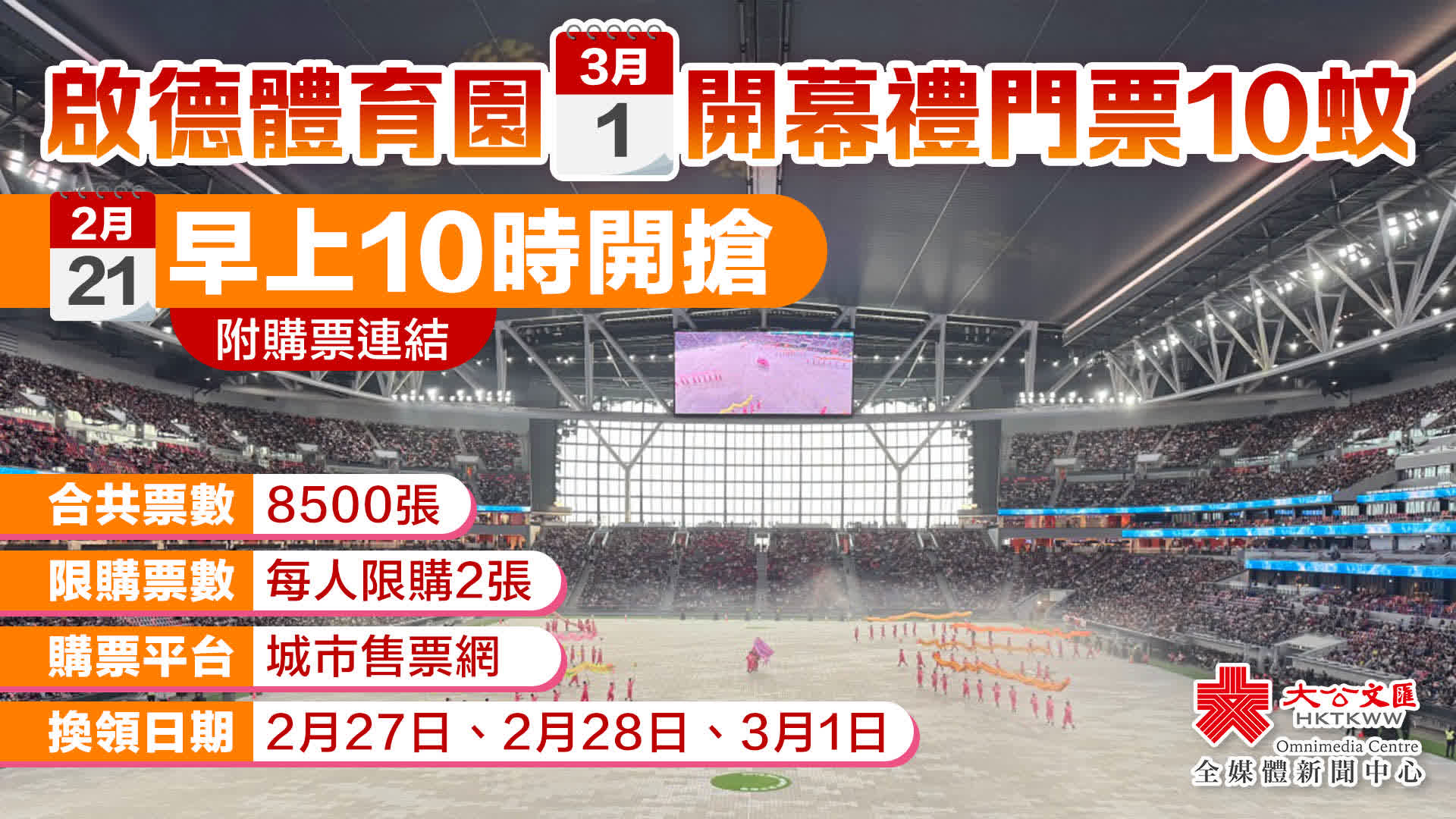 (大公文匯全媒體 記者 九皋)啟德體育園將於3月1日開幕,為香港「盛匯超級三月」打響頭炮。今次開幕典禮共計發放33600張門票,其中8500張門票將會於今早(21日)10時起,以每張10港元的價格於城市售票網開售,市民每次可以購買2張門票,先到先得。