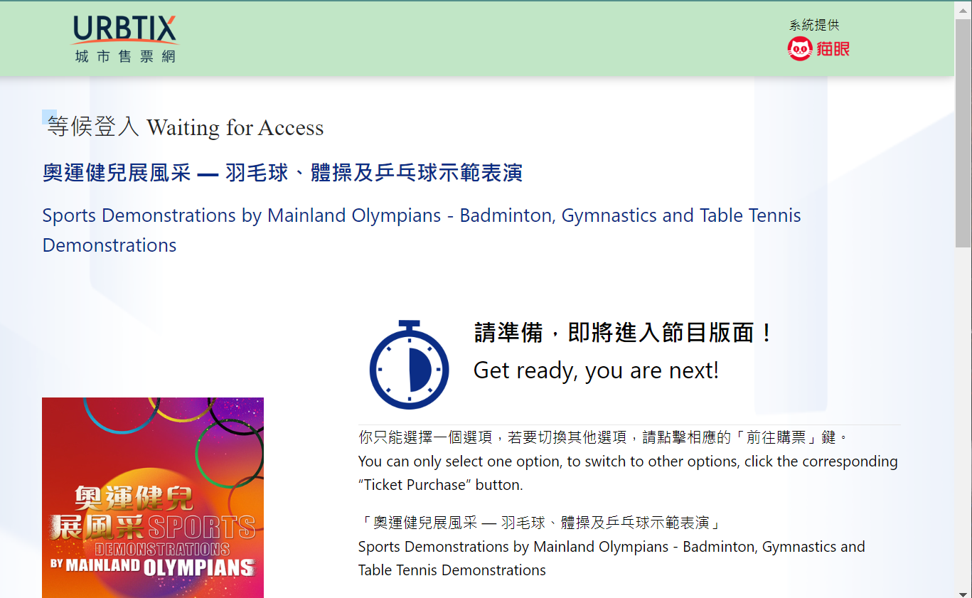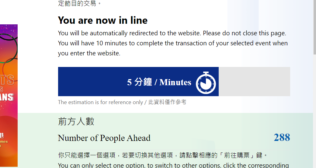 以奧運健兒訪港搶票為例,記者10時一到準時點進購票連結,網頁顯示前面有288人排隊,需等待5分鐘。不過實際約2分鐘後,記者已順利進入購票頁面。