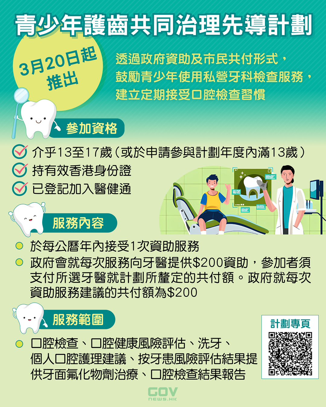 衞生署宣布,青少年護齒共同治理先導計劃3月20日推出,透過政府資助和市民共付形式,鼓勵青少年使用私營界別牙科檢查服務,建立定期接受口腔檢查的良好習慣。