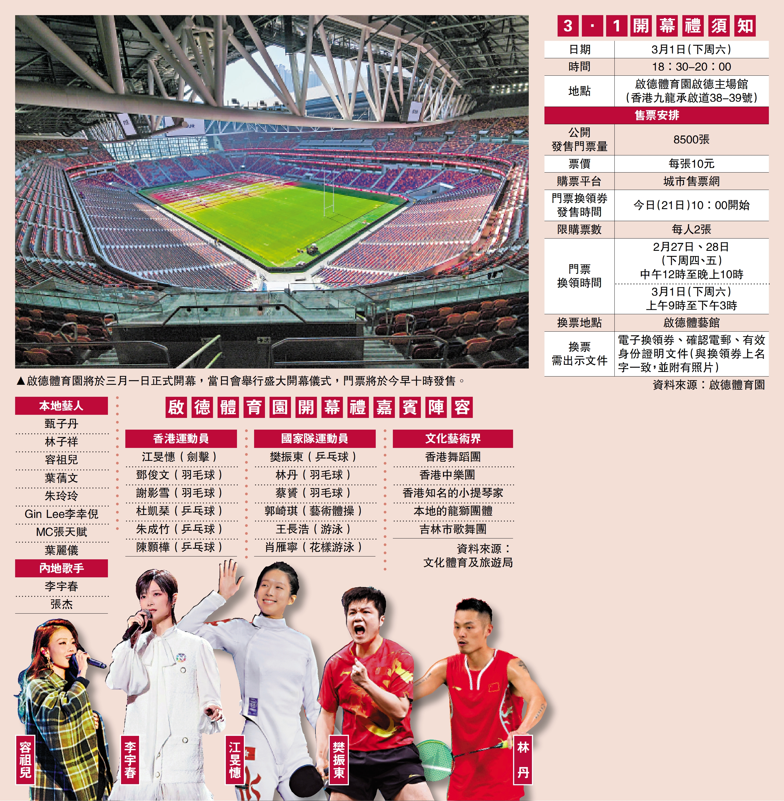 (大公報 記者 易曉彤)啟德體育園3月1日正式開幕,當晚6時30分將舉行盛大開幕儀式,將有來自內地和本地的體育、文化、演藝界精英呈獻精彩演出。33600張門票由政府及啟德體育園分發,其中8500張門票換領券,今早十時起於城市售票網發售,每張10元。門票換領將採取實名制,不可轉讓及不設退換。
