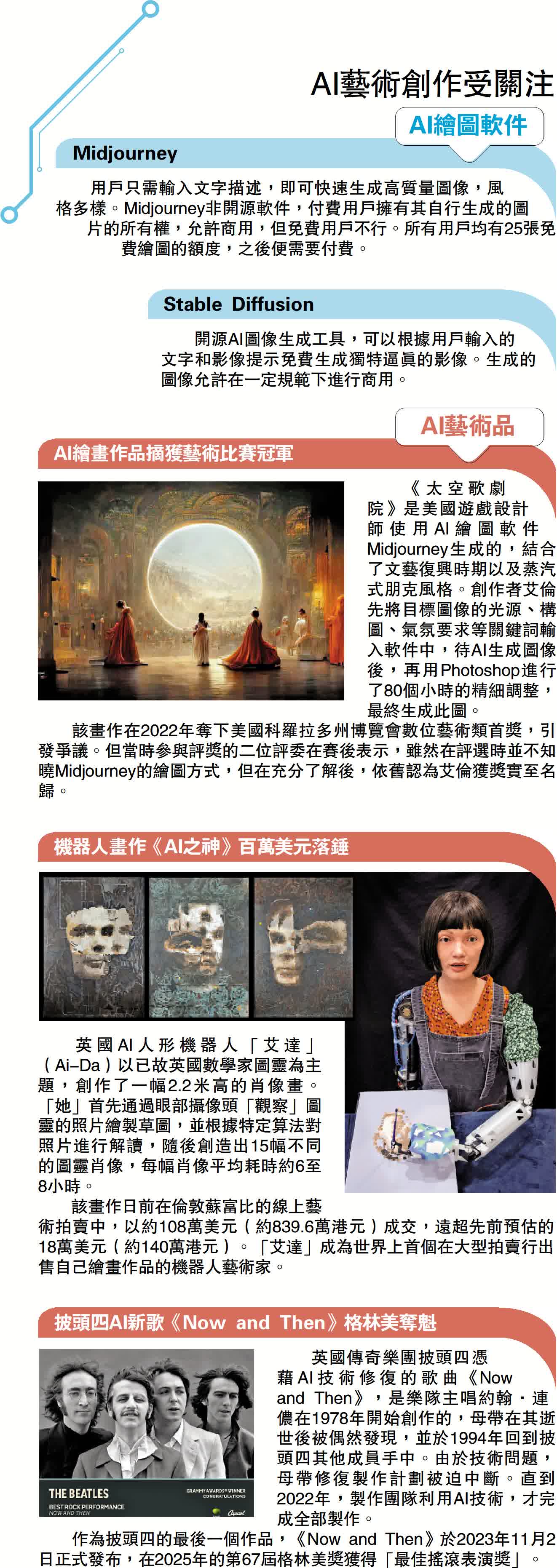 影視導演、AI創作者小葱(化名)接受大公報記者採訪時表示,對於AI作品而言,如果藝術家們應用AI創作出的作品是一種觀念性的表達,而非着重於技法本身,那麼AI創作的作品也是一項藝術。小葱說,從版權爭議的角度而言,如果藝術家利用AI輕易地「復刻」某一IP(知識產權),如迪士尼的米老鼠,這是對創作者非常不尊重的行為;但如果藝術家只是學習這一IP的風格,這裏就存在一個灰色地帶。她提到,創作者們在繪畫、影視製作等的學習中,或多或少都會存在學習、模仿其他創作者及作品的過程,這種學習和AI的學習,本質的區別在哪裏呢?以藝術史來講,它也是從模仿開始誕生的,那這些模仿又應該如何去界定?小葱認為,當中本身就是一個灰色地帶,存在更多的討論空間。