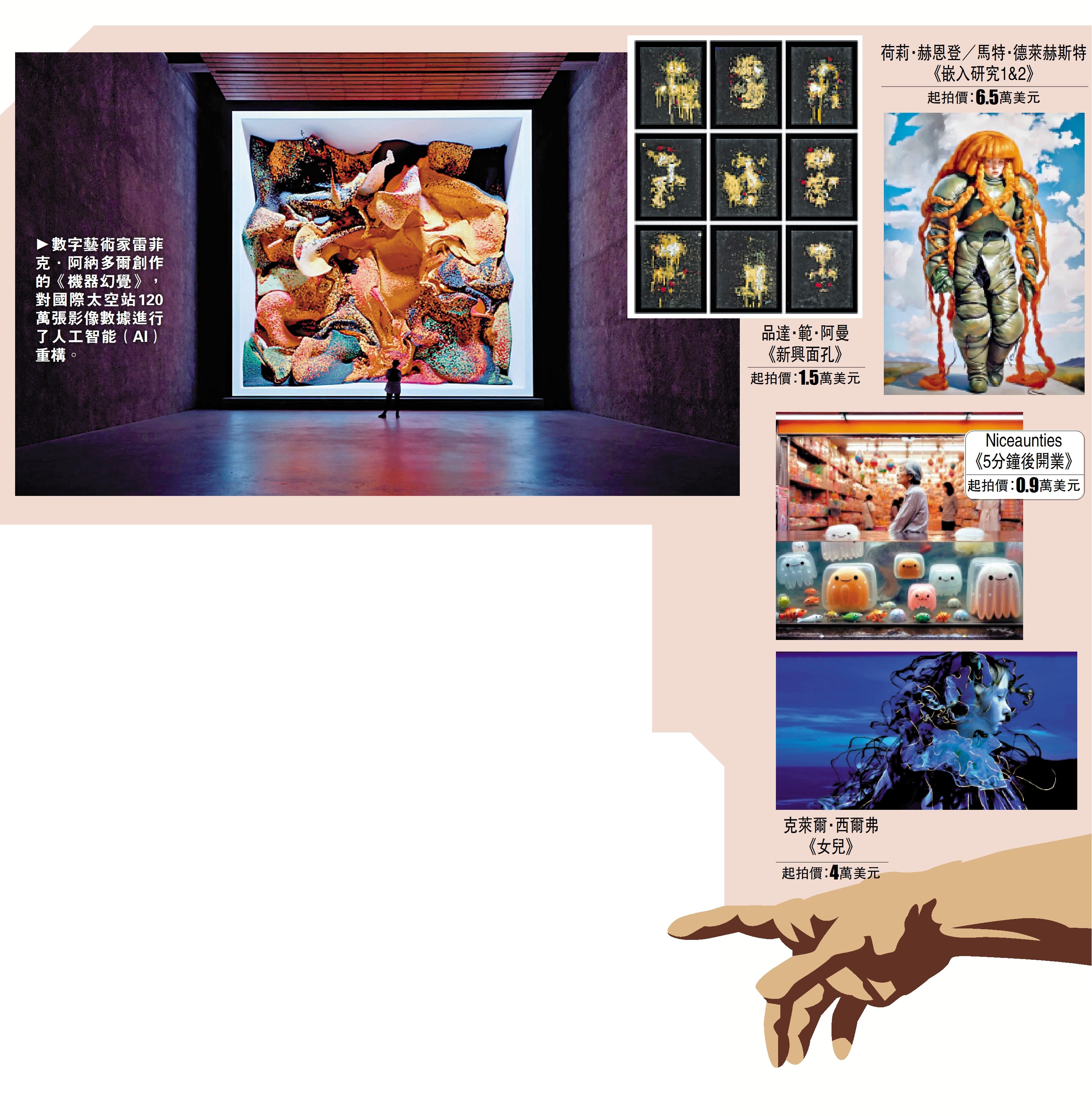 在所有作品中,品達·範·阿曼的作品《新興面孔》估價最高,高達18萬至25萬美元,由神經網絡驅動機械臂自主完成,被視為AI生成藝術的重要里程碑。雷菲克·阿納多爾的《機器幻覺》估價15萬至20萬美元,對國際太空站120萬張影像數據進行了AI重構。