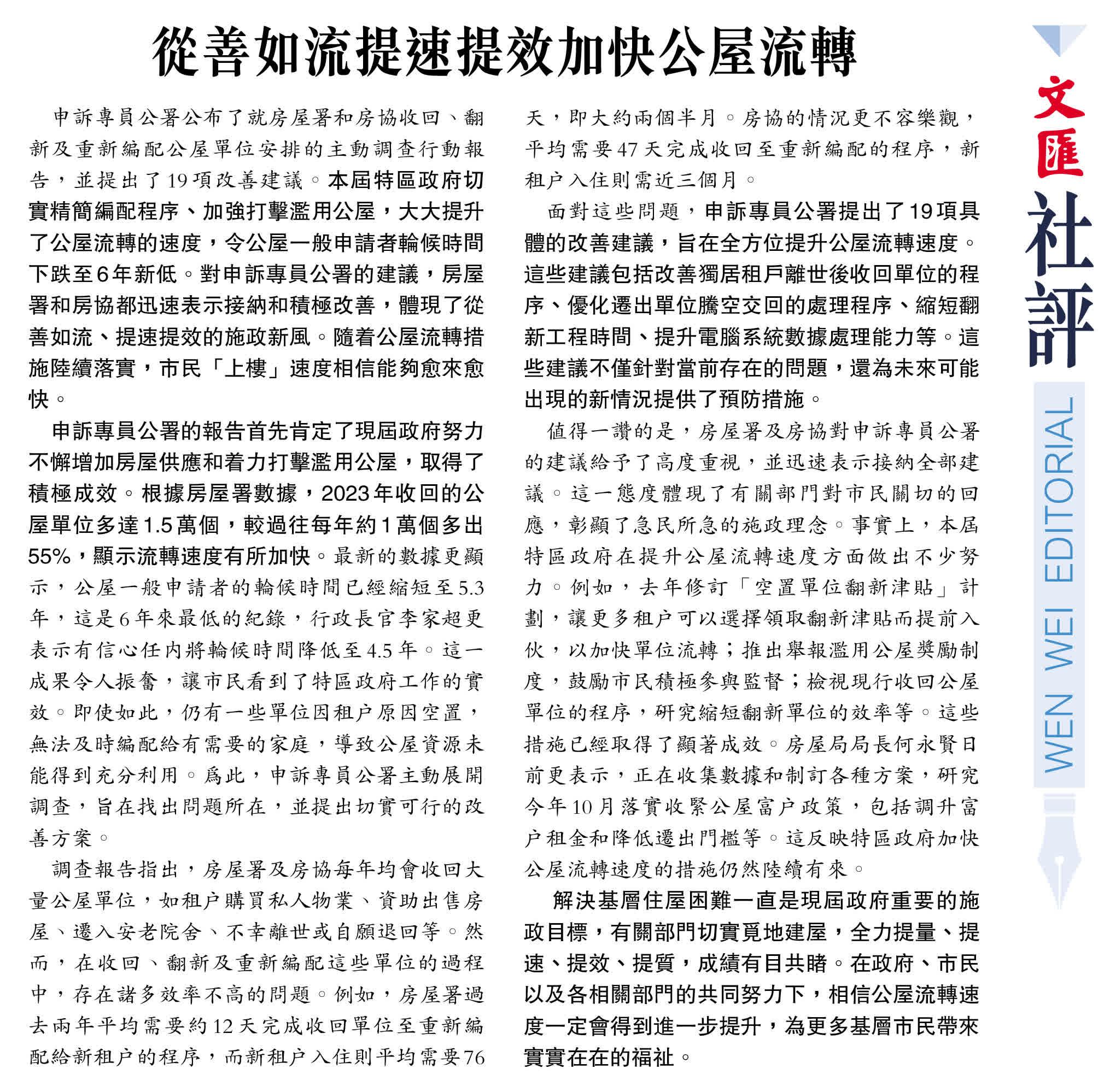 值得一讚的是,房屋署及房協對申訴專員公署的建議給予了高度重視,並迅速表示接納全部建議。這一態度體現了有關部門對市民關切的回應,彰顯了急民所急的施政理念。事實上,本屆特區政府在提升公屋流轉速度方面做出不少努力。例如,去年修訂「空置單位翻新津貼」計劃,讓更多租戶可以選擇領取翻新津貼而提前入伙,以加快單位流轉;推出舉報濫用公屋獎勵制度,鼓勵市民積極參與監督;檢視現行收回公屋單位的程序,研究縮短翻新單位的效率等。這些措施已經取得了顯著成效。房屋局局長何永賢日前更表示,正在收集數據和制訂各種方案,研究今年10月落實收緊公屋富戶政策,包括調升富戶租金和降低遷出門檻等。這反映特區政府加快公屋流轉速度的措施仍然陸續有來。