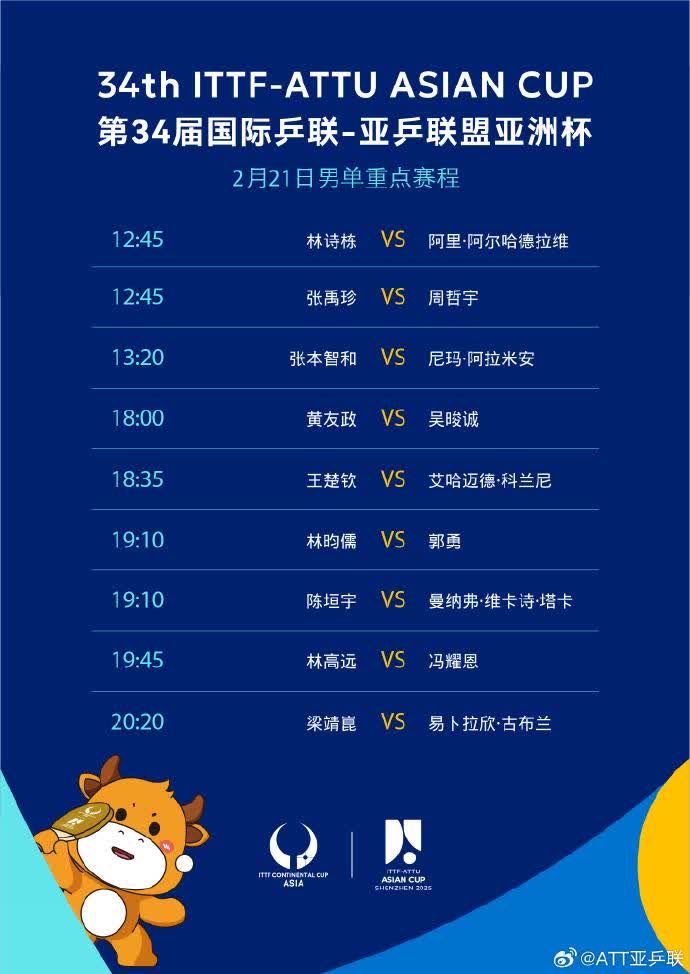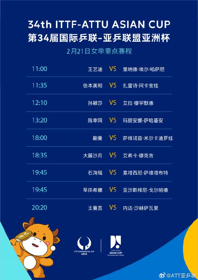 大公文匯網報道,今天是2025乒乓球亞洲盃小組賽最後一個比賽日。11:00,王藝迪率先出場對陣里納德·埃爾·哈薩尼。12:10,孫穎莎迎戰艾拉·穆罕默德。18:35,王楚欽將對戰艾哈邁德·科蘭尼。