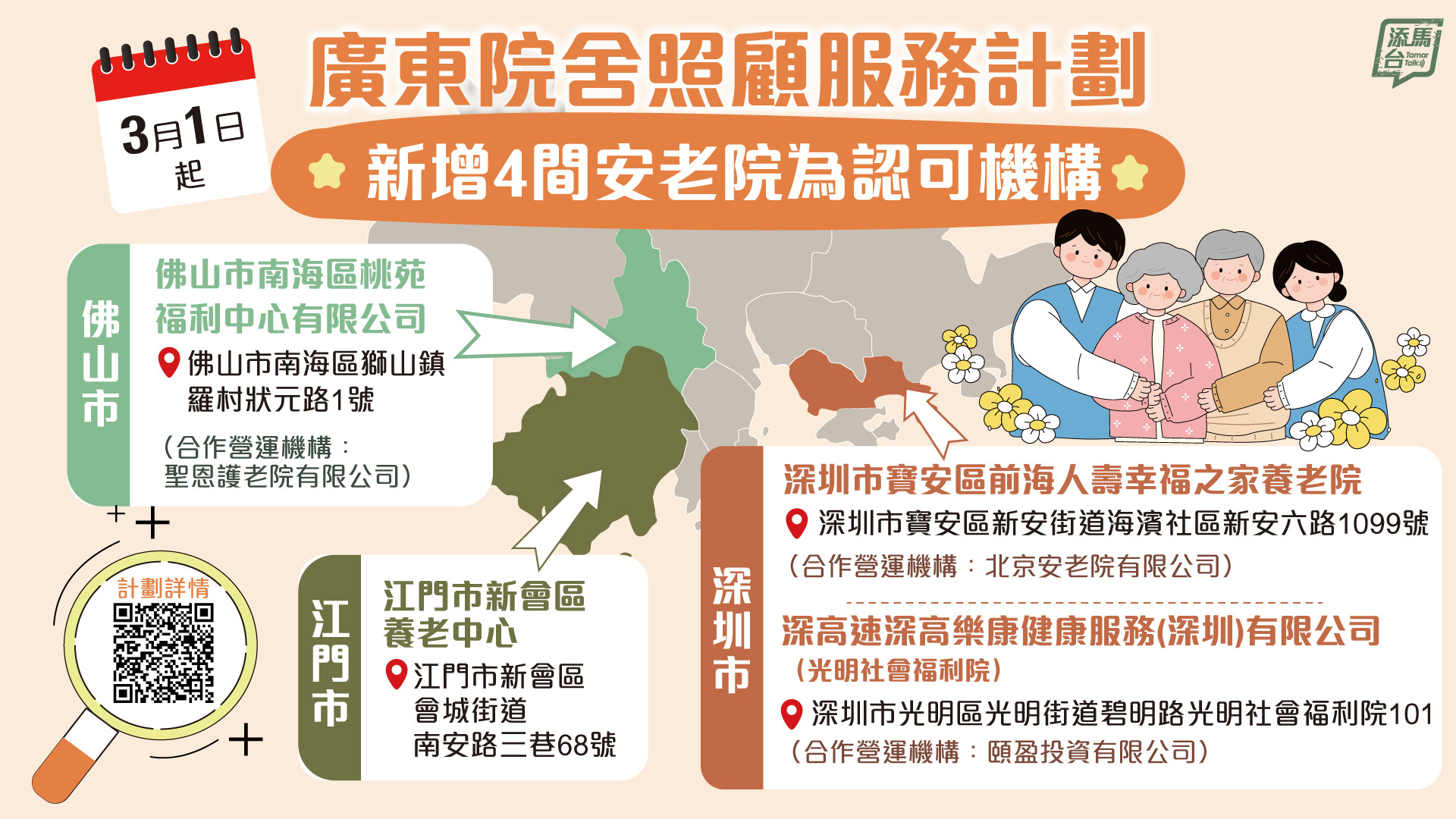 「廣東院舍照顧服務計劃」由3月1日起,將新增4家安老院為認可服務機構,分布於江門、佛山和深圳,為參加計劃的長者提供資助護理安老宿位。