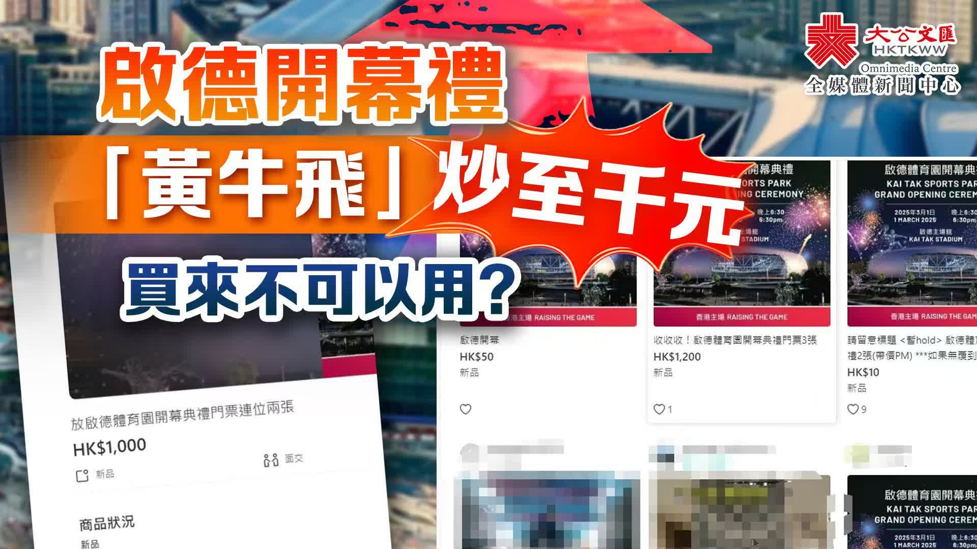 大公文匯全媒體報道,啟德體育園3月1日晚6時30分舉行開幕禮,其中8500張門票今(21日)早10時在城市售票網公開發售,約10時30分全部售罄。隨後網上交易平台出現炒賣「黃牛飛」的情況,有人以高價販售開幕禮門票,售價由300至1800元一張不等。