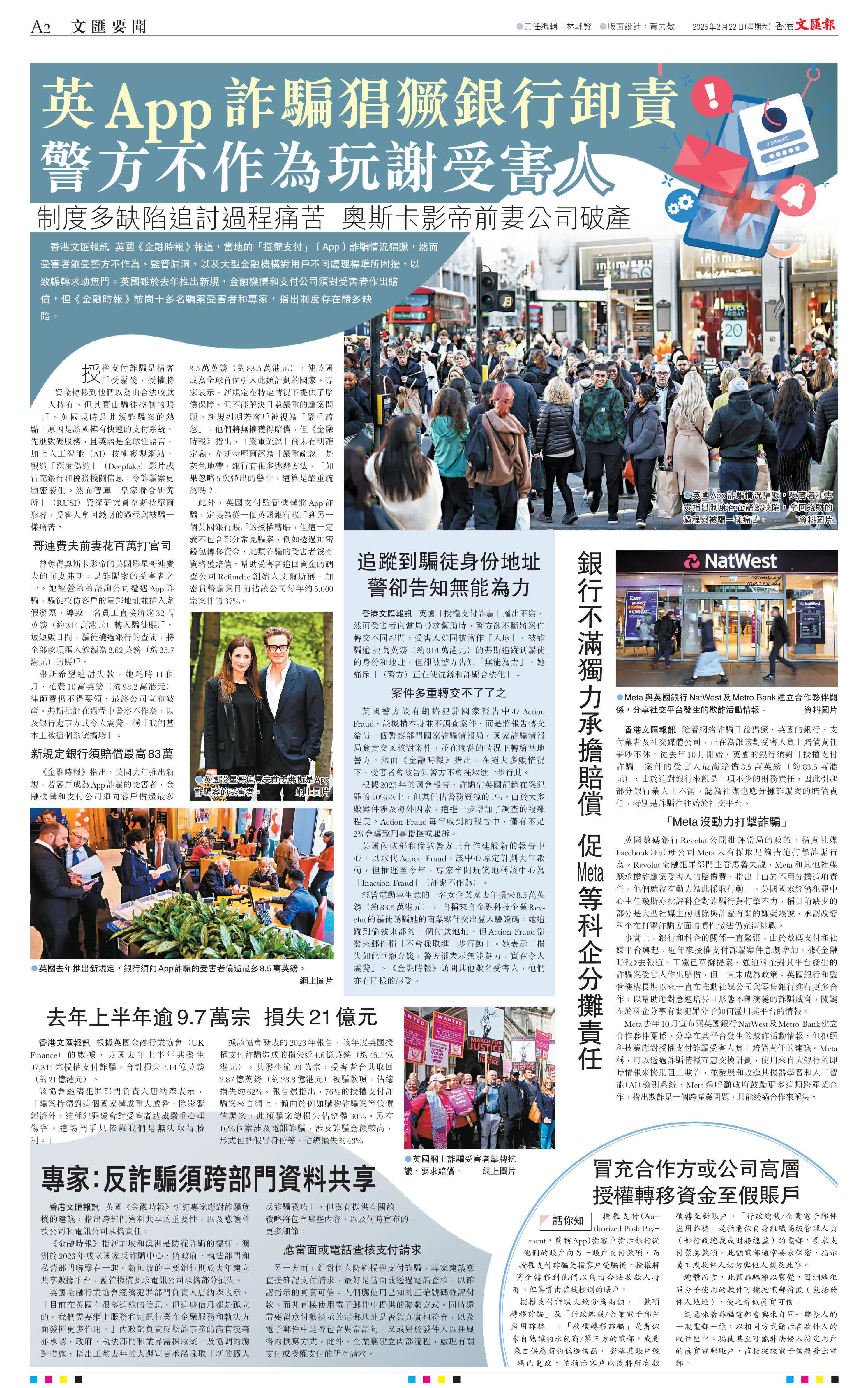 香港文匯報援引英國《金融時報》報道,當地的「授權支付」(App)詐騙情況猖獗,然而受害者飽受警方不作為、監管漏洞,以及大型金融機構對用戶不同處理標準所困擾,以致輾轉求助無門。英國雖於去年推出新規,金融機構和支付公司須對受害者作出賠償,但《金融時報》訪問十多名騙案受害者和專家,指出制度存在諸多缺陷。