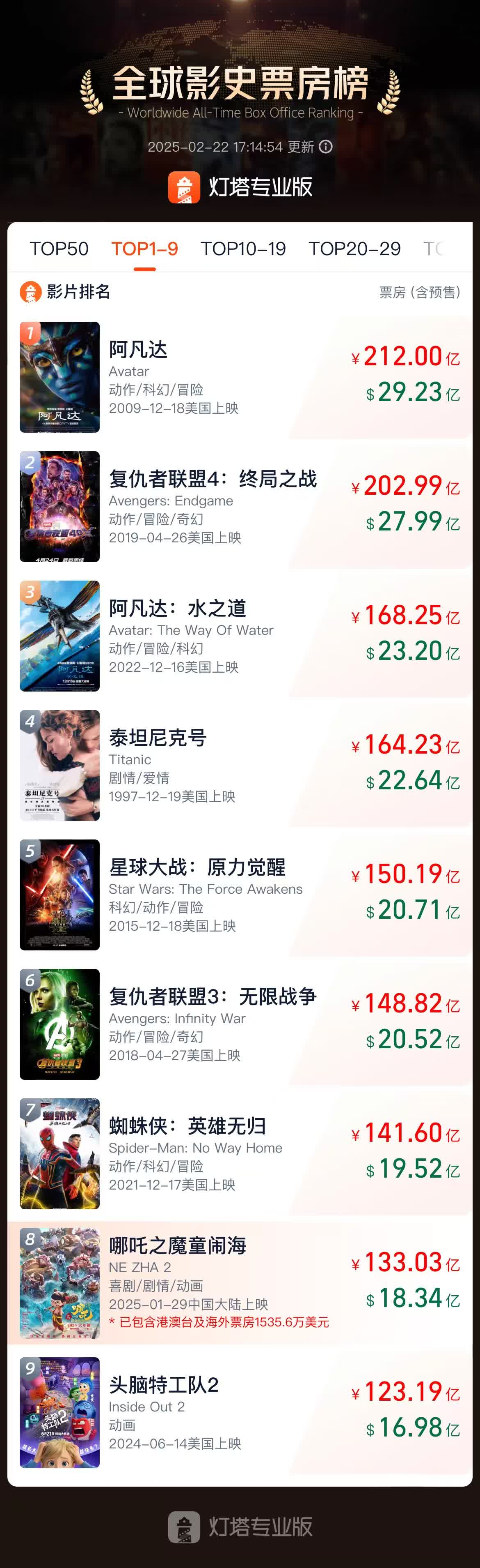 《哪吒之魔童鬧海》全球累計票房(含預售及海外)