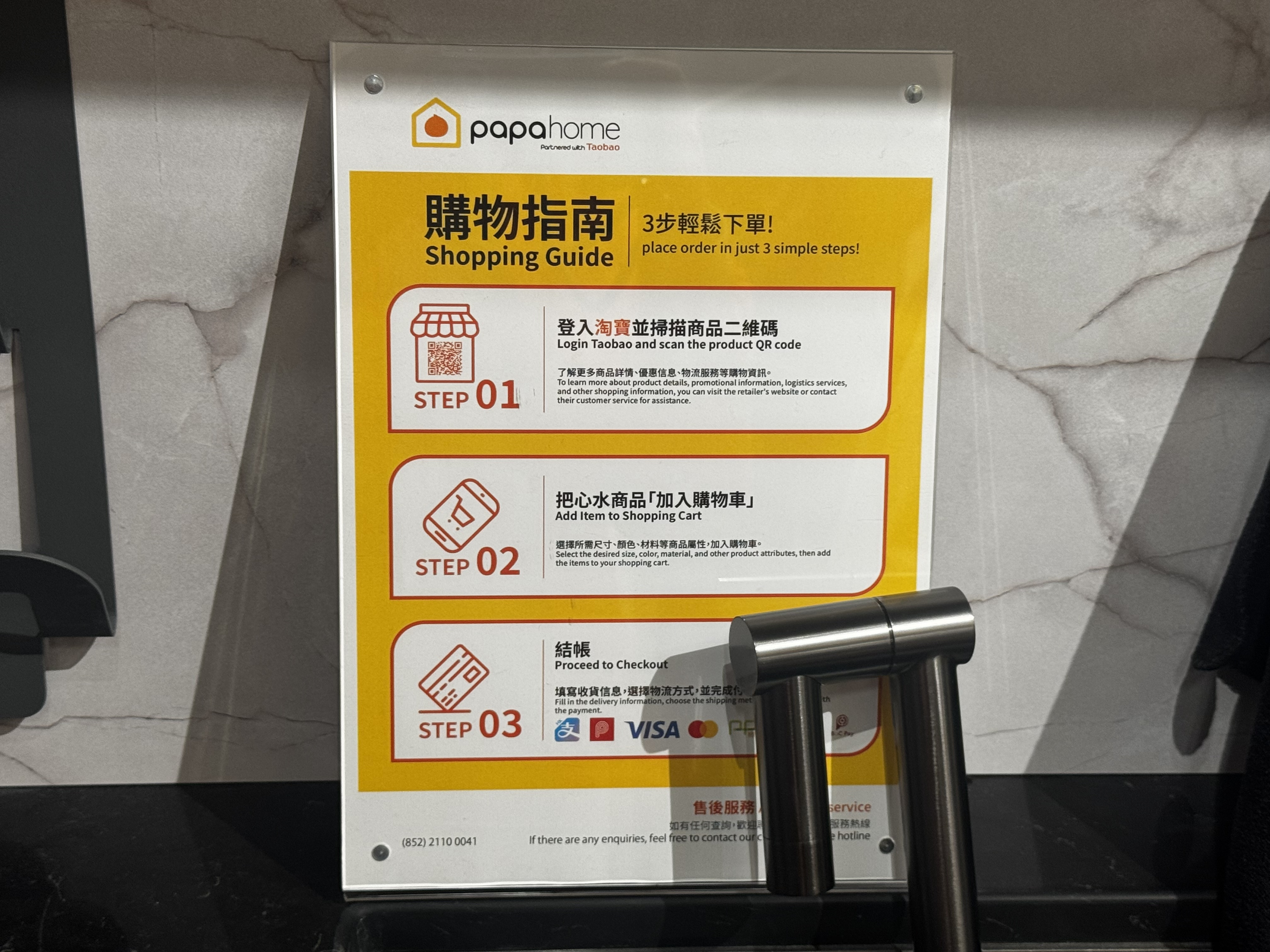 據記者觀察,PapaHome的購物方式與宜家(IKEA)有所不同。宜家可以現場落單,將心儀的傢具即刻帶回家。但Papahome是體驗店,如果顧客看中某件傢具,需要掃描該傢具上面貼着的二維碼,在淘寶網站上找到對應的店舖和商品進行購買,網上落單後需要一些時日才能送達家中。若需要額外的安裝服務,則需下載另一個軟件「Papabo」,與師傅報價並約定安裝時間。運費和安裝費均需要另外支付,費用從幾百元到上千元不等。