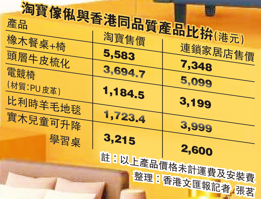 香港文匯報記者根據現場傢俬價格與香港市面連鎖傢俬店作格價對比,發現同等材質、外觀的產品,淘寶實體店的部分傢俬確實更為優勝,例如頭層牛皮梳化售價(未計運費)3,694.7港元,比香港市面同類產品便宜近四成。至於運費,職員介紹,分為直運和集運兩種,但整體有九成商品的運費低於600港元,近一半更低於100港元。他建議梳化之類的大件傢俬使用直運,運費介乎200至300港元之間。對於部分需要安裝的傢俬,消費者可以在物流中心選擇相關服務,收費為300至700港元之間。
