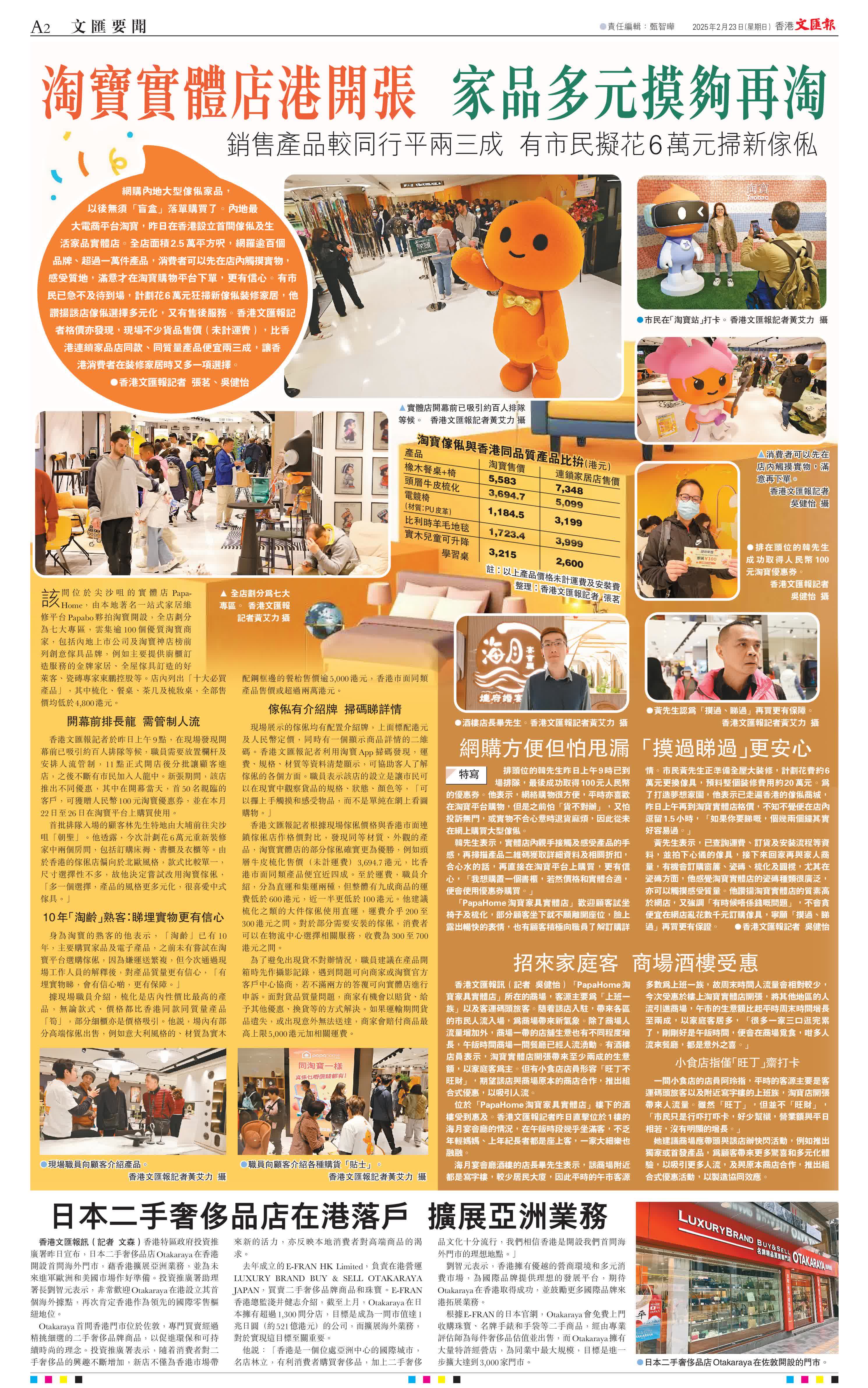 該間位於尖沙咀的實體店PapaHome,由本地著名一站式家居維修平台Papabo夥拍淘寶開設,全店劃分為七大專區,雲集逾100個優質淘寶商家,包括內地上市公司及淘寶神店榜前列創意傢具品牌,例如主要提供廚櫃訂造服務的金牌家居、全屋傢具訂造的好萊客、瓷磚專家東鵬控股等。店內列出「十大必買產品」,其中梳化、餐桌、茶几及梳妝桌,全部售價均低於4,800港元。