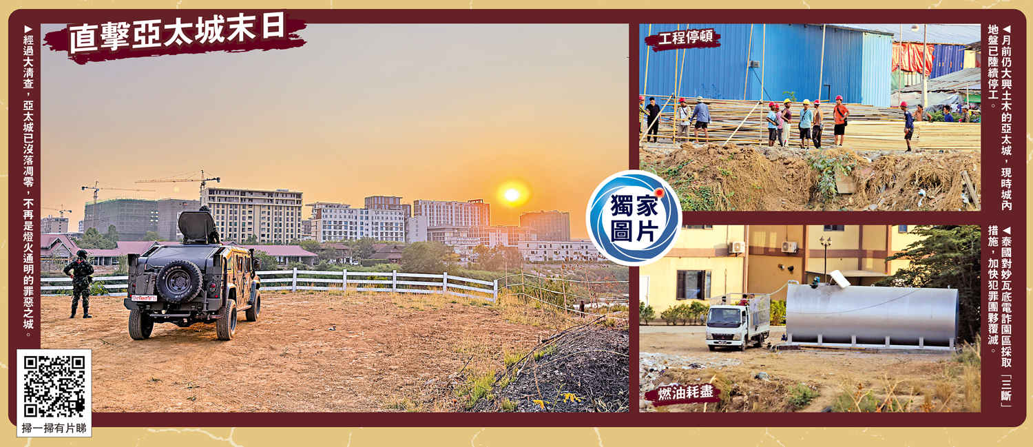 記者昨日重返最大規模電詐園亞太城,發現此處已淪死城;入夜後烏燈黑火,不再是月前五光十色的不夜城,城內興建的地盤已停工;詐騙園Star Complex的招牌已毀大半,人去樓空,惡名昭彰的KK園區亦已封城,多個電詐園區只有持槍的武裝警衛隊駐守,妙瓦底對岸有泰國軍警、裝甲車站崗,緬東電詐園區一片死寂。