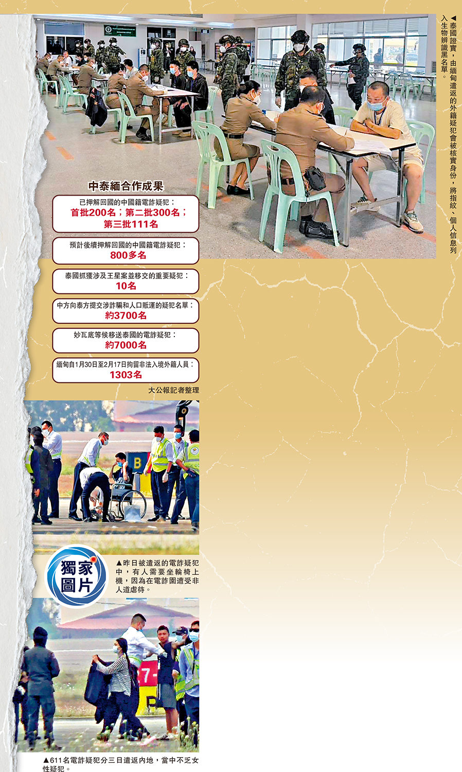 (大公報調查組泰緬邊境報道 施文達 朱燁、凱雷北京報道 調查組 融媒組)中泰緬三國聯手清剿緬甸電詐園區,數以千計被禁錮的電詐疑犯獲救,當中611名中國籍電詐疑犯獲國家包機分批押解回國,昨日第三批111人順利押返。