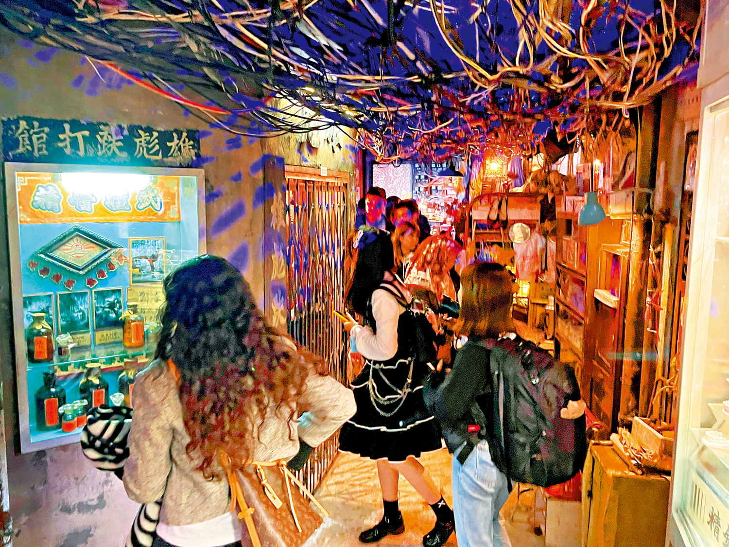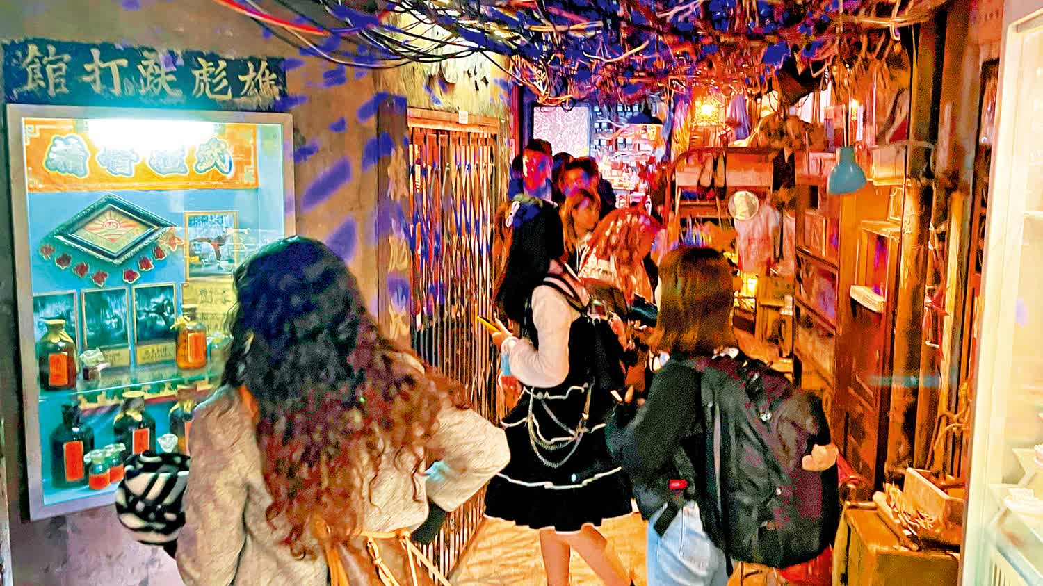 大公報記者實地走訪,到達展覽所在樓層,就見到巨大的「九龍城寨」霓虹燈字。場內有許多電線橫過頭頂,觀眾身旁就是八十年代的九龍城寨布景,舊式理髮廳、玻璃內膽保溫壺、叉燒蛋飯,老香港的物件琳琅滿目,令人恍如置身九龍城寨。展覽館內人頭湧湧,遊人傍着經典場景打卡拍照,年長市民指着場景內的物件,向親友講述數十年前的生活。