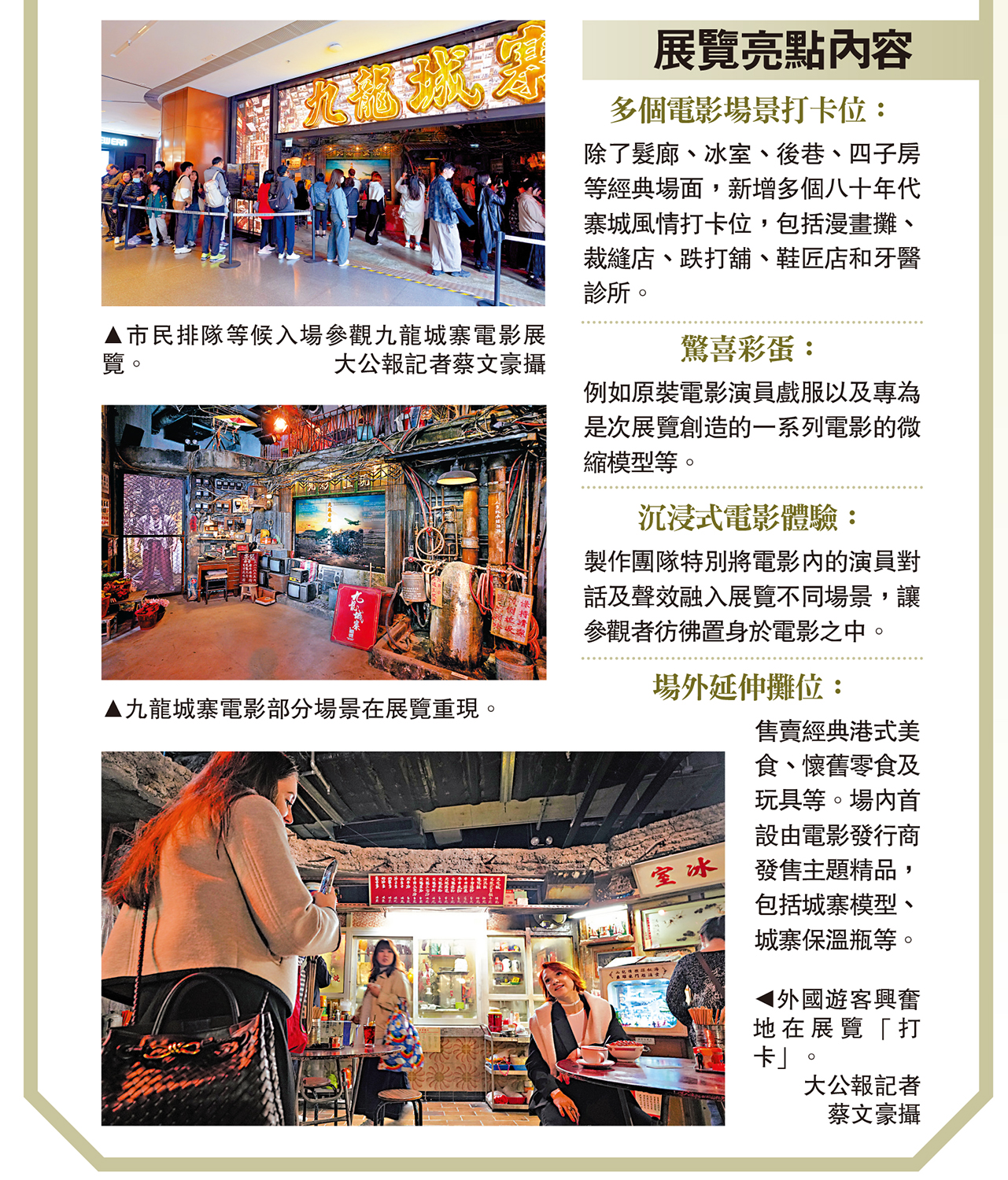 (大公報 記者 劉碩源)電影《九龍城寨之圍城》去年在香港上映時大受歡迎,票房超過一億元。旅發局去年10月在香港國際機場舉辦有關展覽,重現多個電影場景,12月中移師啟德的大型商場,兩個月來吸引逾18萬人參觀「朝聖」。昨日周末,大公報記者走訪展覽館,見到館前持續有約數十人的等候人龍,不少是來自日本的旅客。跟着電影去旅遊,實地重溫電影取景地,是近年受歡迎的旅遊模式之一。有旅遊業界人士建議,局部開放電視城、開發經典電影取景地等方式,可望帶動電影旅遊及周邊消費。
