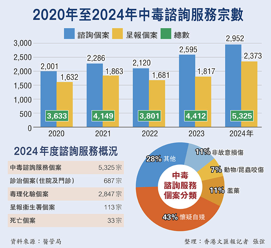 醫管局香港中毒控制中心日前回顧去年中毒諮詢服務情況,指出去年服務量為5,325宗,較2023年的4,412宗上升了21%,當中2,952宗為中毒諮詢個案,2,373宗則為呈報個案。至於中毒呈報個案,則包括因濫用毒品而出現中毒問題。