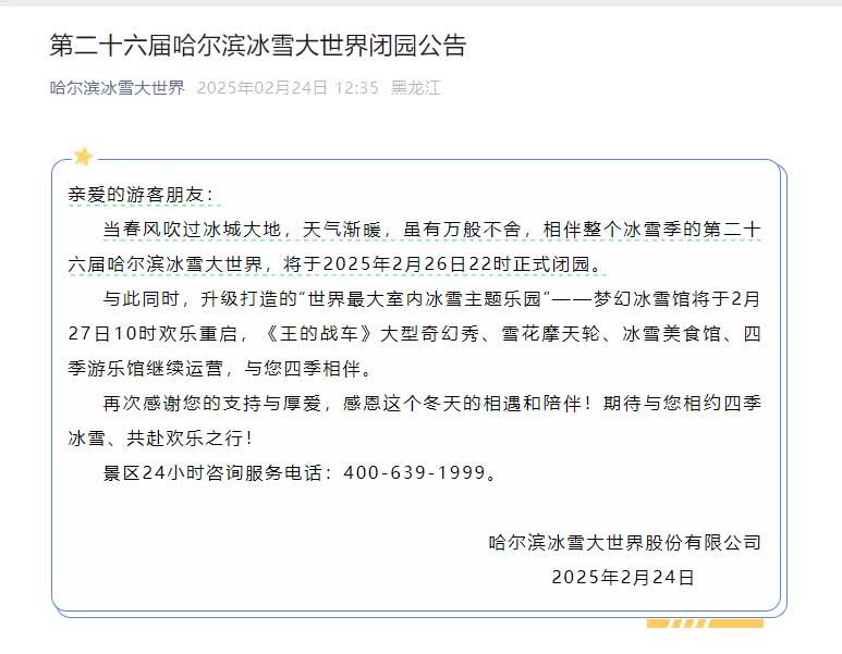 大公文匯網報道,今日,哈爾濱冰雪大世界在其官方微信公眾號發布公告稱,園區將於2025年2月26日22時正式閉園。