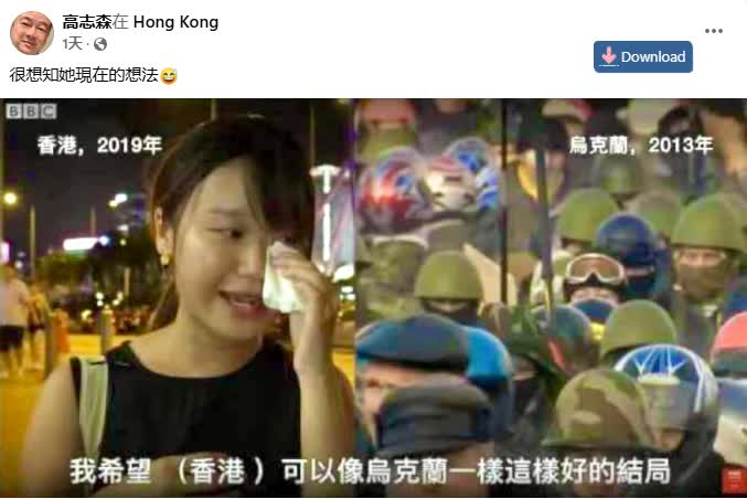 大公文匯網報道,2019年,有亂港分子因看了烏克蘭「為自由而戰」的紀錄片而落淚,並說「希望香港能像烏克蘭一樣有好的結局」。2月22日,香港著名導演高志森在社交媒體發帖表示:很想知道她(亂港分子)現在的想法。