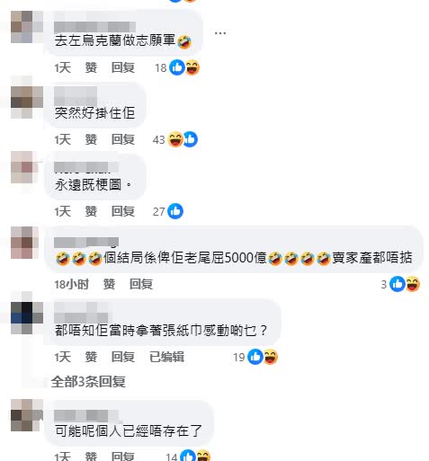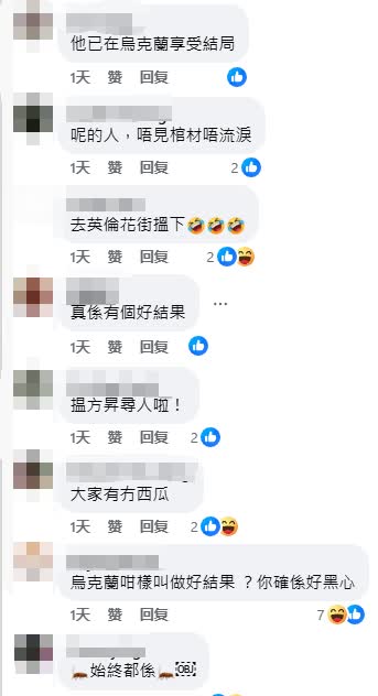 在高志森貼文的評論區,不少香港網友評論道:「烏克蘭咁樣叫做好結果?確係好黑心。」「結局係俾佢老尾屈5000億,賣家產都唔掂」「我希望她正過着民煮豉油的生活,千萬唔好再返黎。」