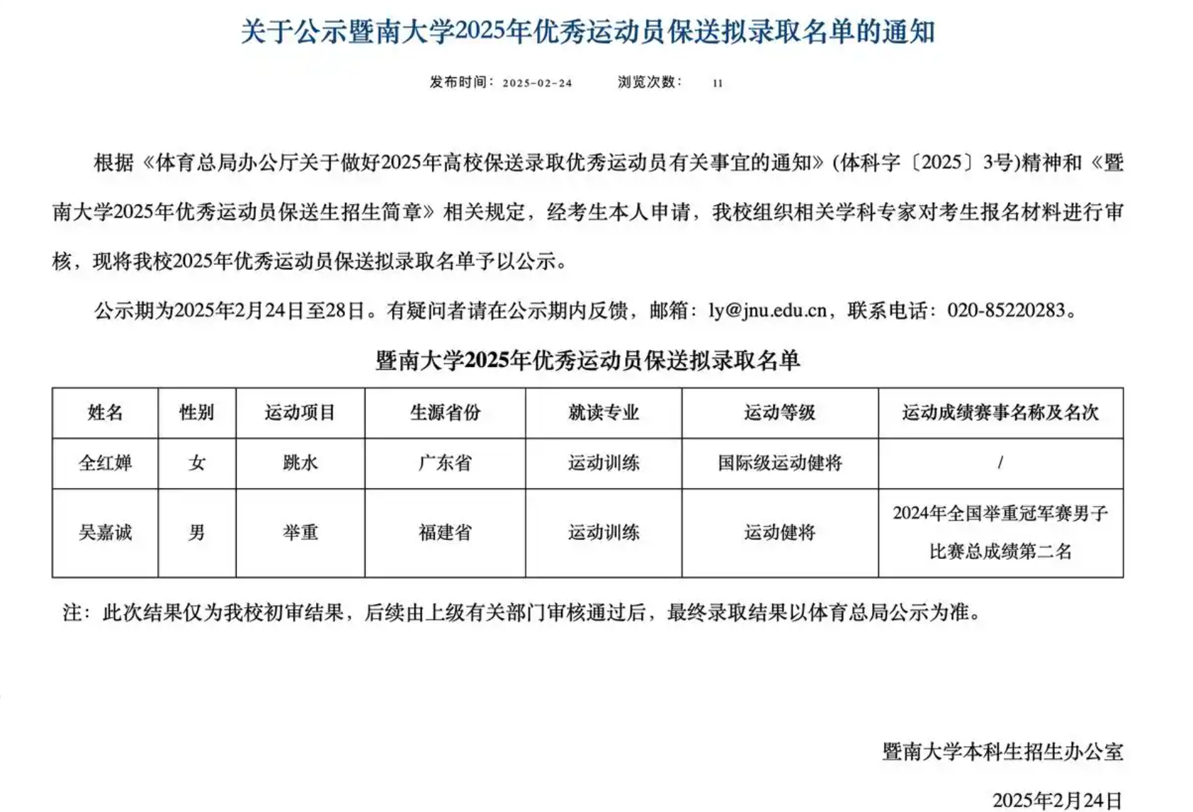 (大公文匯網 記者 記者 盧靜怡 廣州報道)今日(2月24日),暨南大學公示2025年優秀運動員保送擬錄取名單通知,全紅嬋在列。擬錄取名單顯示,跳水運動員全紅嬋擬就讀運動訓練專業,運動等級為國際級運動健將。全紅嬋2007年生於湛江,是中國奧運史上最年輕的三金得主。全紅嬋在比賽中展現出的實力和在後台展現的親和力,讓她在香港擁有眾多粉絲,還被昵稱為」嬋寶「。去年全紅嬋作為國家隊一員訪港時,更是人氣爆棚。為此,全紅嬋擬入讀暨大的消息一公布,便在擁有很多港澳學生就讀的暨南大學引起轟動。不少香港師兄師姐都表現得十分興奮,非常期待開學時能與「嬋寶」相遇。