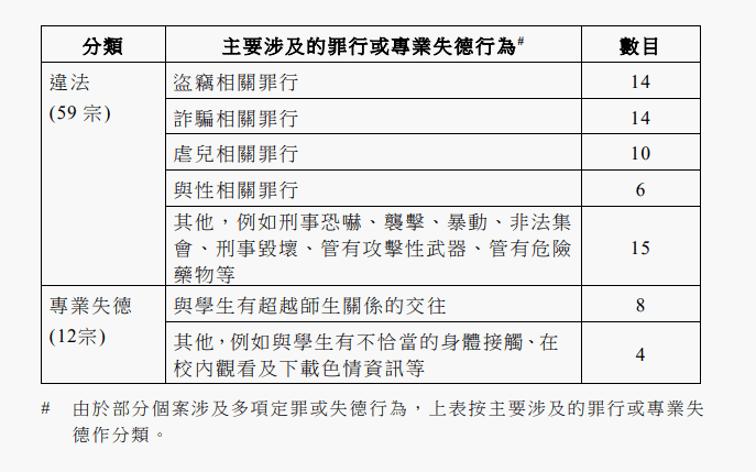 違法個案中,涉及盜竊及詐騙相關罪行宗數分別佔14宗、與虐兒相關罪行佔10宗、與性相關罪行佔6宗,涉其他罪行個案涉15宗,局方舉例指這些罪行包括刑事恐嚇、襲擊、暴動、非法集會、刑事毀壞、管有攻擊性武器、管有危險藥物等。