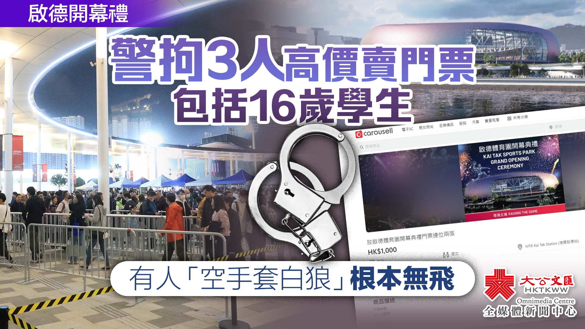 大公文匯全媒體報道,啟德體育園將於3月1日開幕,售價10元的開幕典禮門票上周五(21日)開售約半小時已售罄,隨即網上出現高價黃牛飛。警方經調查後,昨日(24日)拘捕1男2女,涉嫌售賣6張開幕禮假門票,其中兩名被捕人聲稱出售的開幕禮門票電子換領券根本不存在。