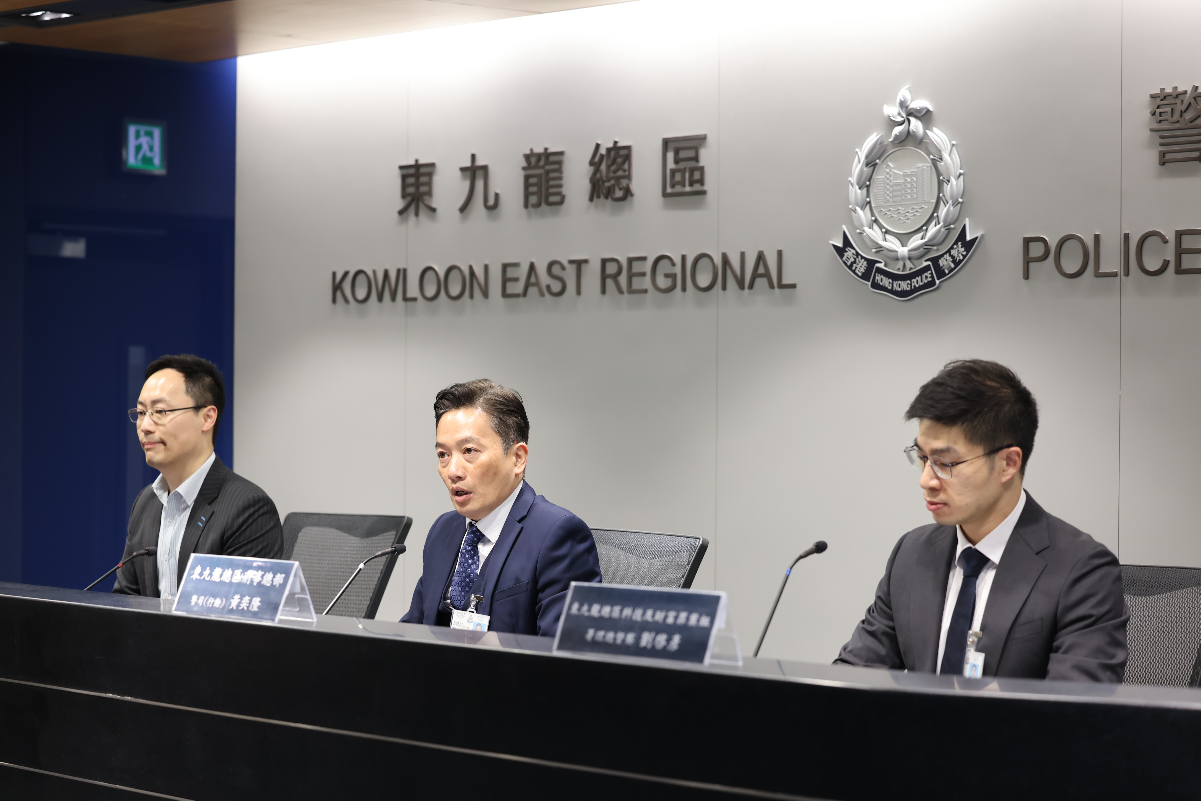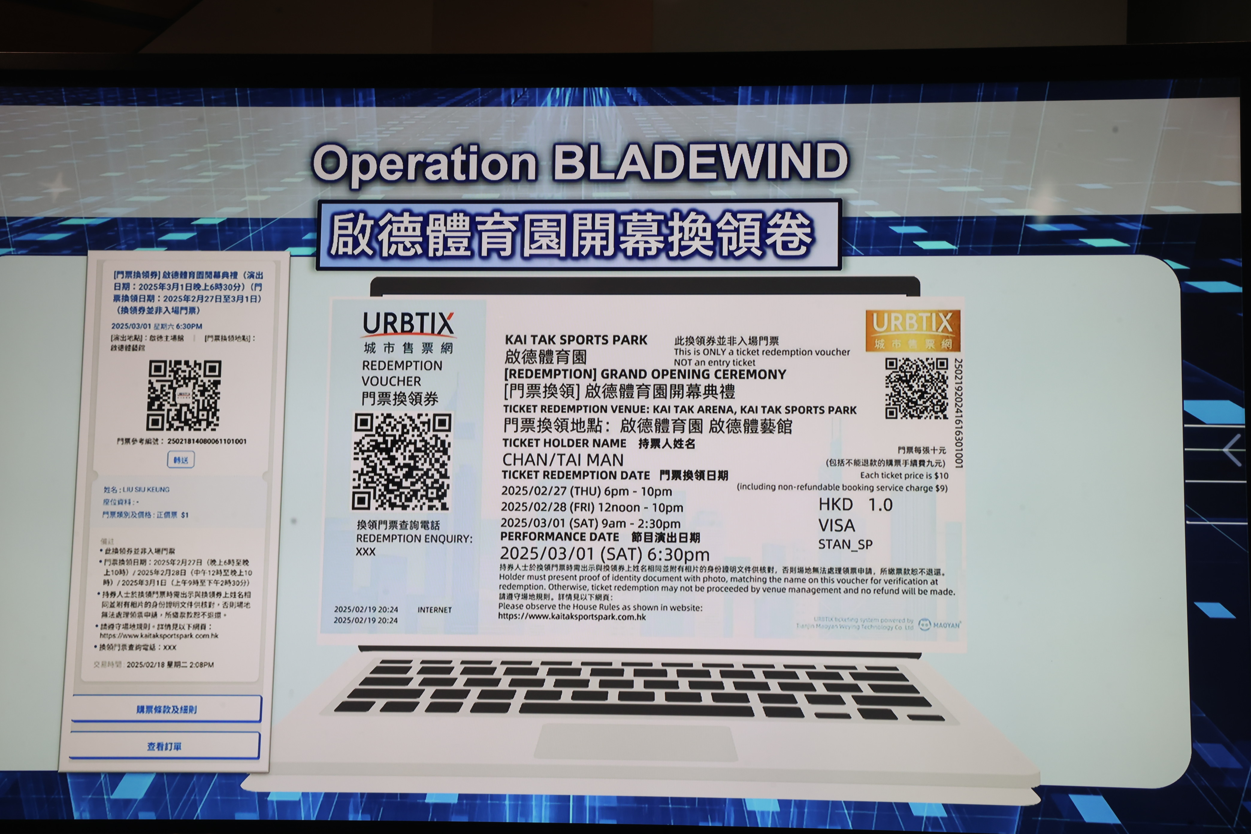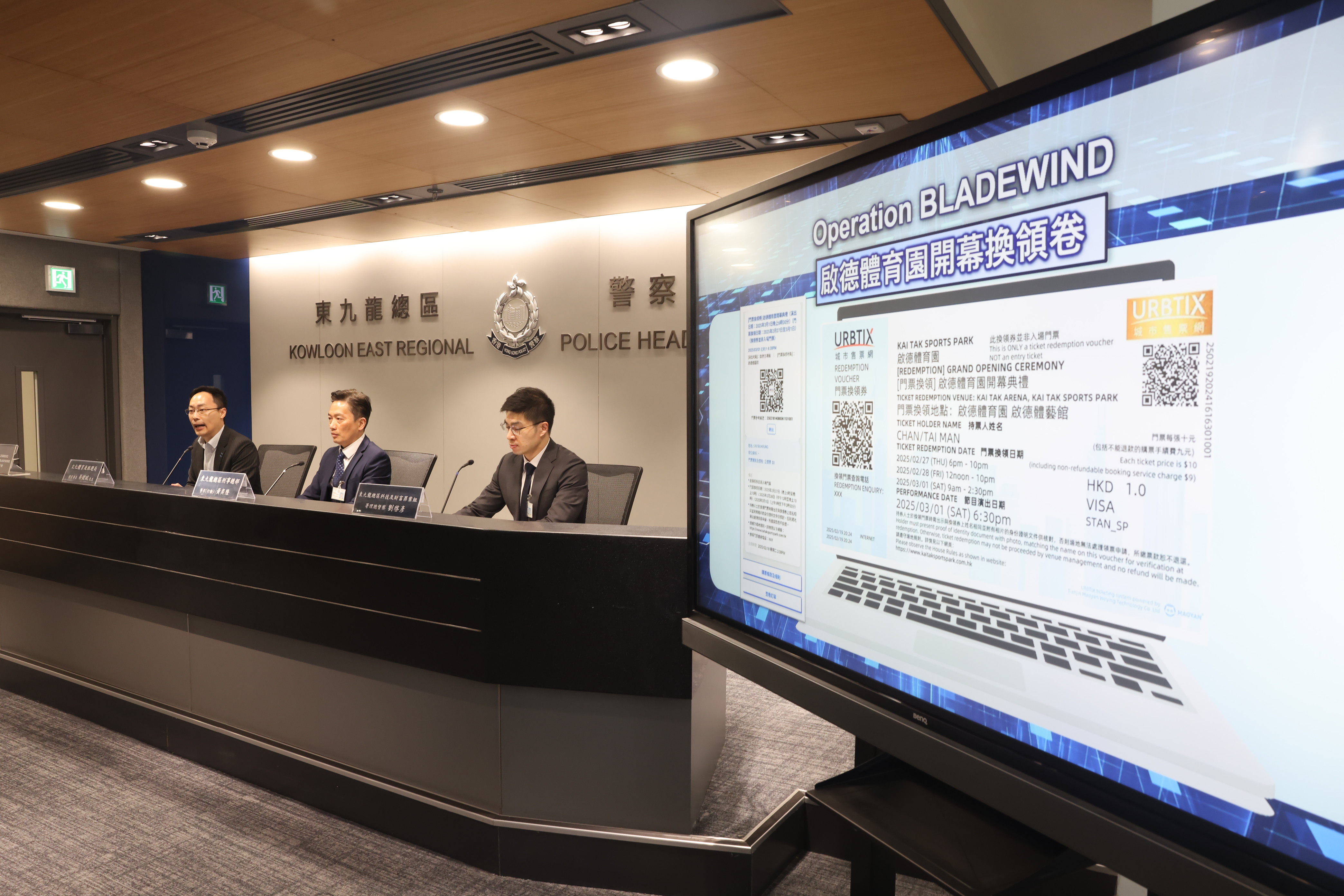 警方東九龍總區刑事部警司黃奕隆、署理總督察劉啟彥及文化體育及旅遊局體育專員蔡健斌簡報案情。黃奕隆表示,警方在2月21日接報,有不法分子在網上平台,聲稱出售3月1日啟德體育園開幕典禮門票,定價遠高於原價。