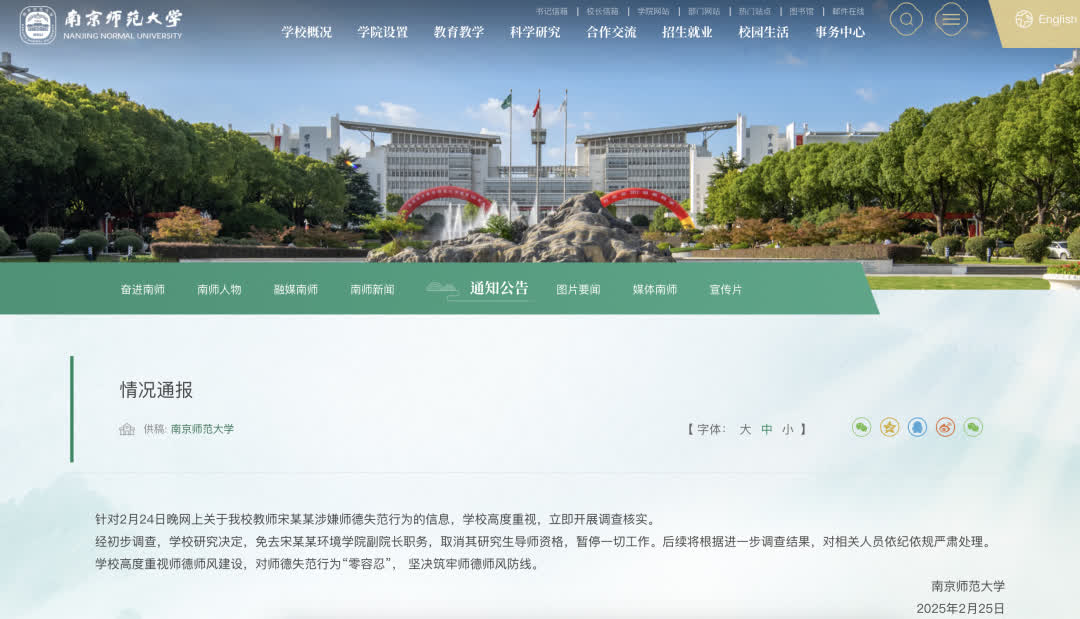 大公文匯網報道,近日,一封關於「南京師範大學一學院副院長宋某婚內出軌其所帶女博士」的公開信引發網友關注。據2月25日南京師範大學通報,學校研究決定,免去宋某某環境學院副院長職務,取消其研究生導師資格,暫停一切工作。後續將根據進一步調查結果,對相關人員依紀依規嚴肅處理。