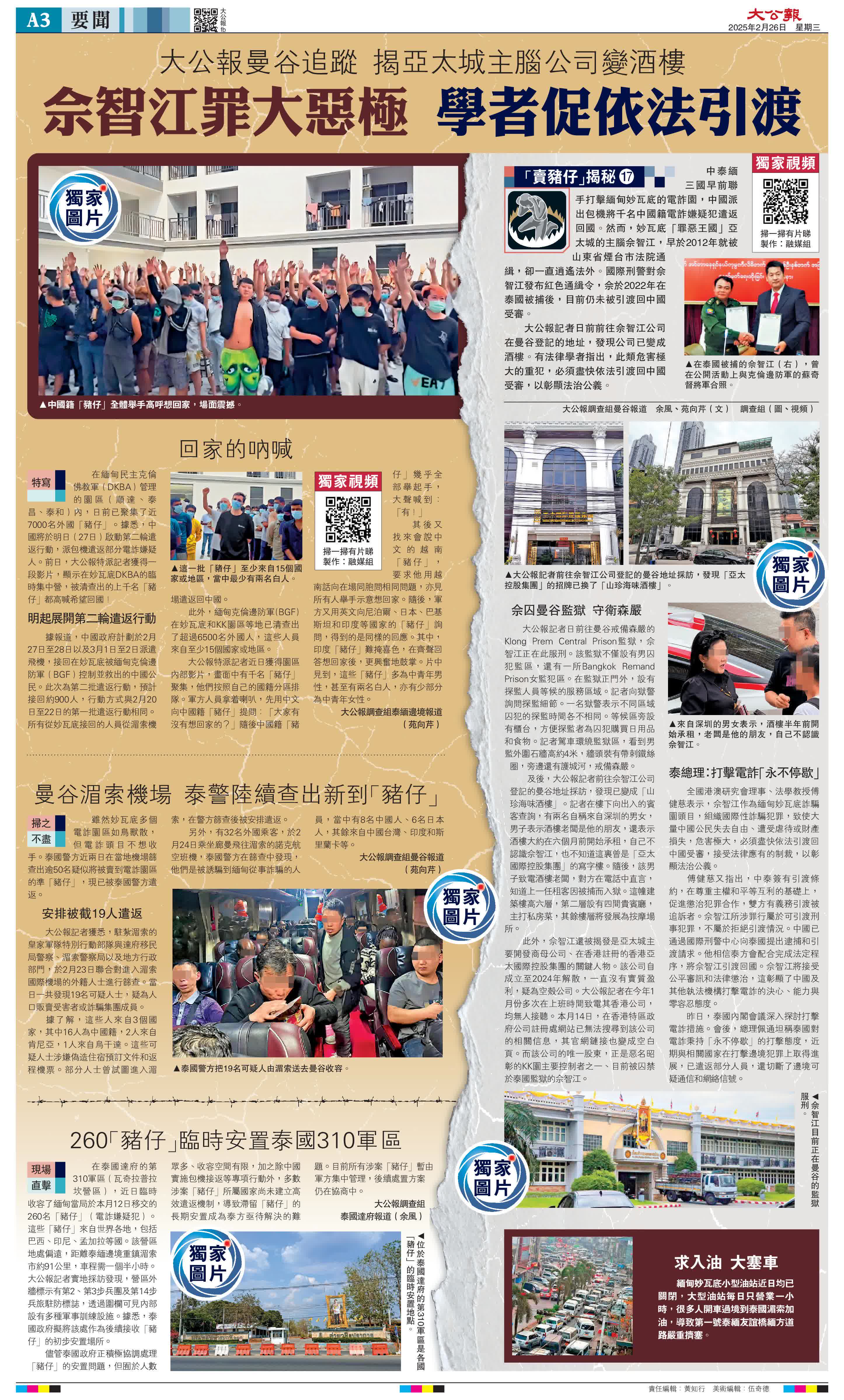 【大公報調查組曼谷報道 余風、苑向芹(文) 調查組(圖、視頻)】中泰緬三國早前聯手打擊緬甸妙瓦底的電詐園,中國派出包機將千名中國籍電詐嫌疑犯遣返回國。然而,妙瓦底「罪惡王國」亞太城的主腦佘智江,早於2012年就被山東省煙台市法院通緝,卻一直逍遙法外。國際刑警對佘智江發布紅色通緝令,佘於2022年在泰國被捕後,目前仍未被引渡回中國受審。