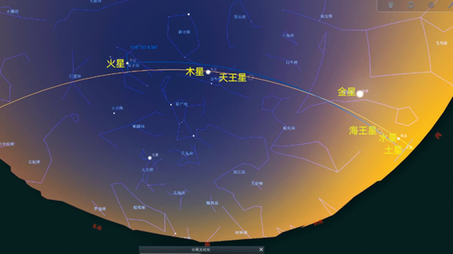香港太空館一級助理館長(公眾節目)張頴珊昨日向《大公報》表示,今次七大行星在天空橫跨的範圍很大,由東邊分布到西邊。日落後30分鐘,會先見到在西邊最光亮的金星,待天色再暗些,才會見到位於天頂附近橙黃色的木星,和東面呈紅色的火星。由於天王星與海王星太遠太暗,肉眼無法觀測。而水星、土星又太接近地平線,可能會被煙霞干擾,難以分辨。