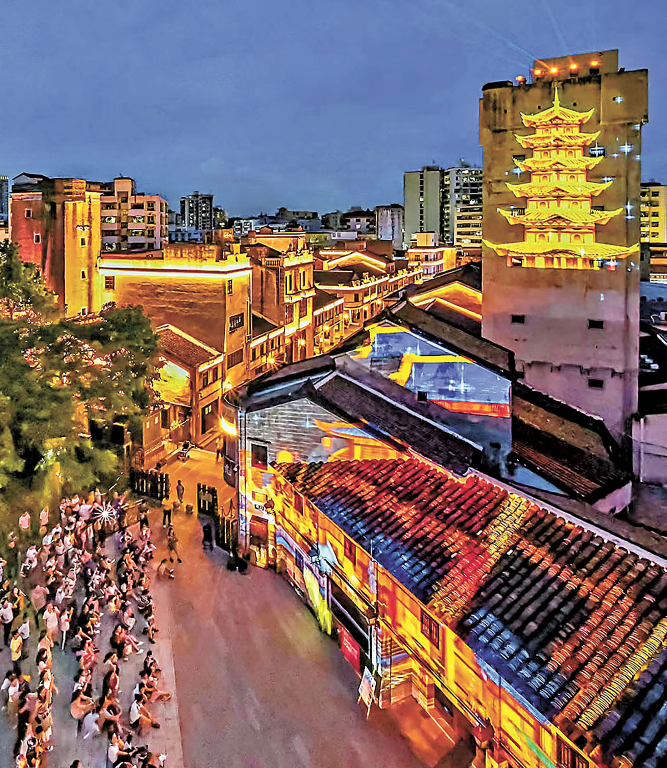 古墟佔地6萬平方米,由五街一巷組成,同時有碉樓8座,商舖民居160多間,保留許多傳統建築風格,結合現代的美食和藝術展覽元素,吸引不少人爭相打卡。其中包括「紅樓」、觀瀾碉樓、觀瀾古寺等,還有最新的晚間燈光秀,每晚7:30分與8:30分,在南門街廣場舉行,將古典建築和現代數理藝術結合,瞬間令古墟成為了焦點。當中由光影投射到古樓上、梵谷的名作《星空》最為震撼,打卡一流。