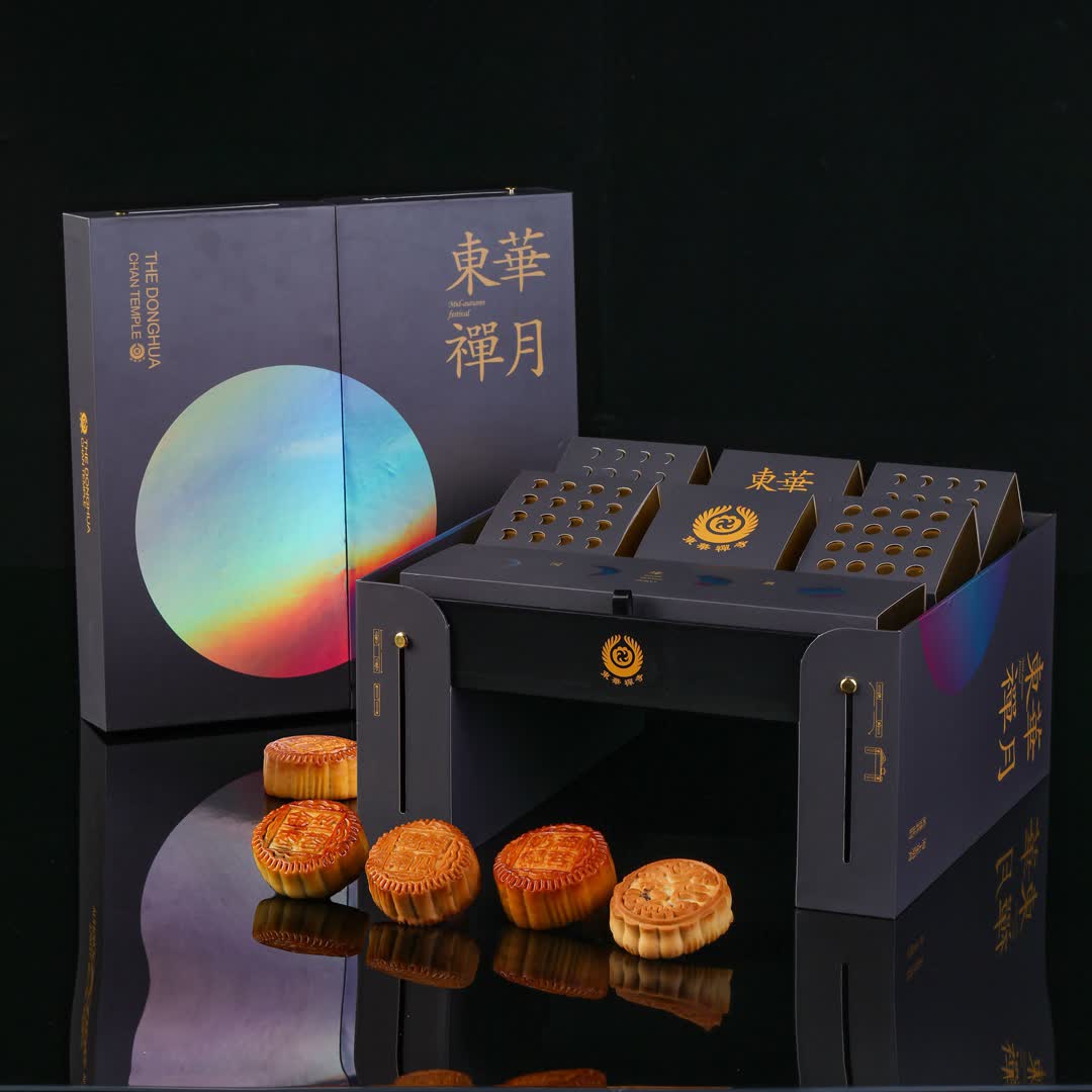東華禪寺原創設計月餅【東華禪月】,將傳統的口味進行升級改造,將那些讓人望而卻步的素食甜品,進行了二次創意升級。創新餡料、精緻餅形,相比於其它重糖重油的月餅,東華禪寺的月餅是月餅界裏的一股清流,吃起來不油膩、無負擔。東華禪月有金絲棗蓉、創新五仁、糖醇南瓜、奶油椰蓉、糖醇豆沙等不同口味。每一個月餅的製作過程,都是制餅師父的專注體現。