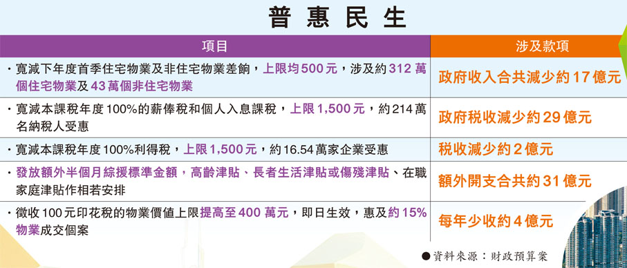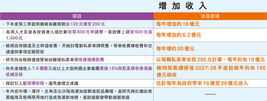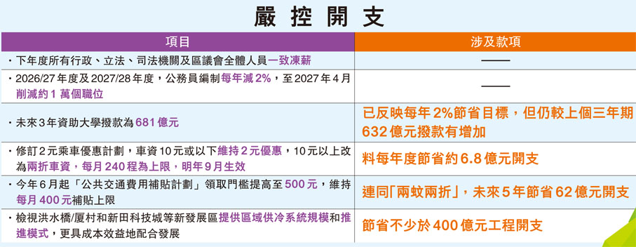 (香港文匯報 記者 劉明)香港特區政府財政司司長陳茂波昨日公布新一份財政預算案,表示本年度政府整體收入預算為約5,596億元,較原來預算少11.6%,綜合赤字為872億元,財政儲備截至下月底預計為6,473億元。期內,利得稅與薪俸稅收入保持平穩,與預算相若,反映香港經濟韌性強勁。為此,預算案提出「強化版」的財政整合計劃,包括四大主線,分別是加速人工智能(AI)發展,以AI賦能其他產業;全速全力推動經濟發展;吸引更多新資金,開拓新市場,擴大朋友圈;嚴格管控公共開支,以節流為主,配以適度開源,目標2025/2026年度開始的3年內,每年整體開支節省2%,令政府經營賬目在2028/2029年度大致達至平衡。
