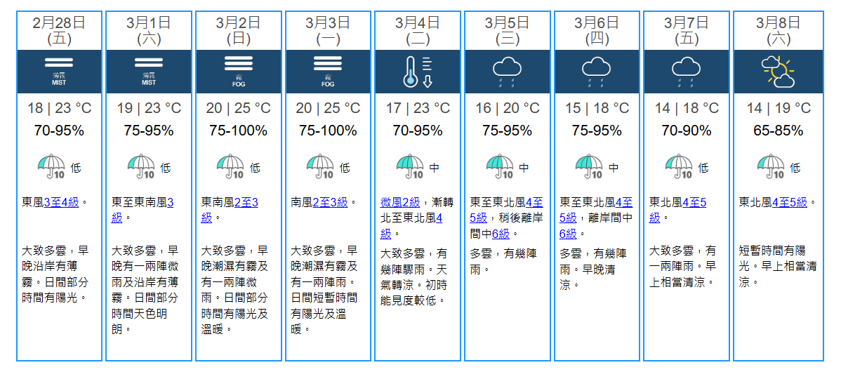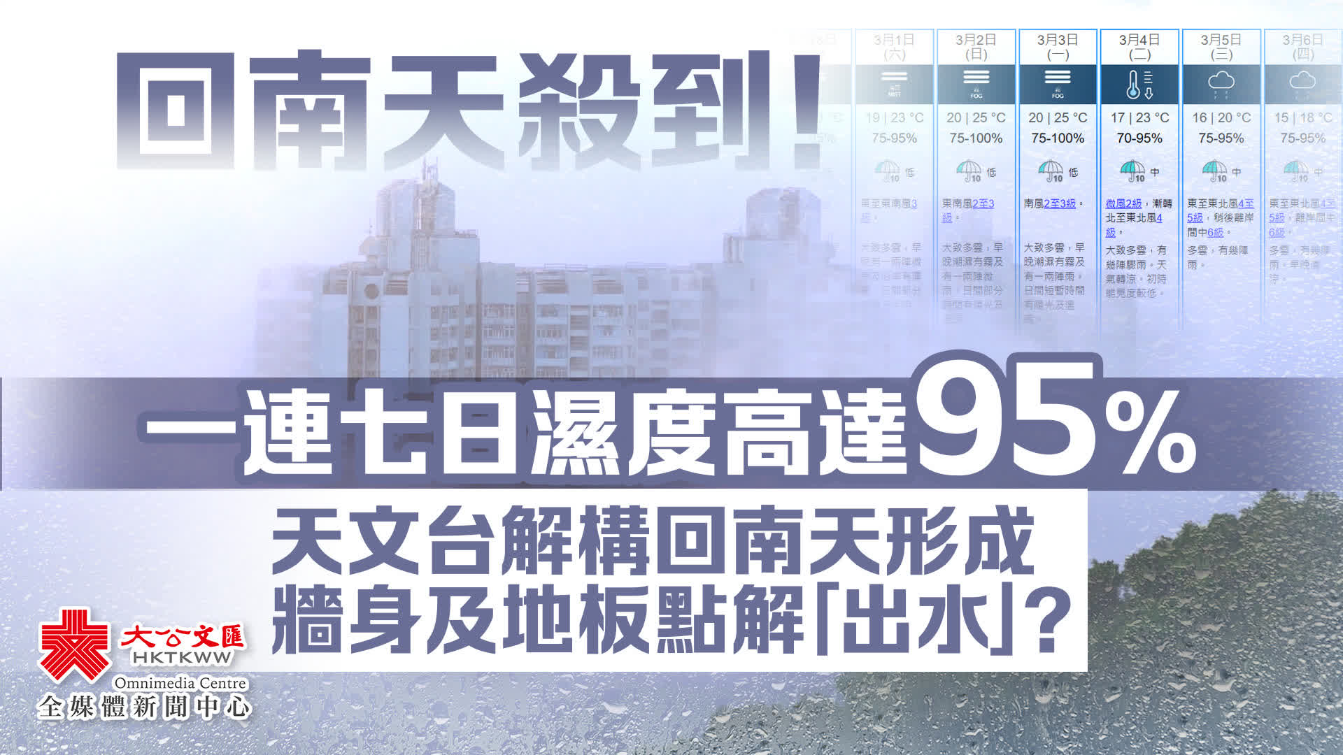 大公文匯全媒體報道,據香港天文台今日(27日)發布的九日天氣預報,未來一連7日濕度可高達95%,周日及下周一(3月2日及3日)更預計達到100%!市民記得準備好除濕機、除濕盒、乾燥劑等,應對即將到來的回南天天氣。