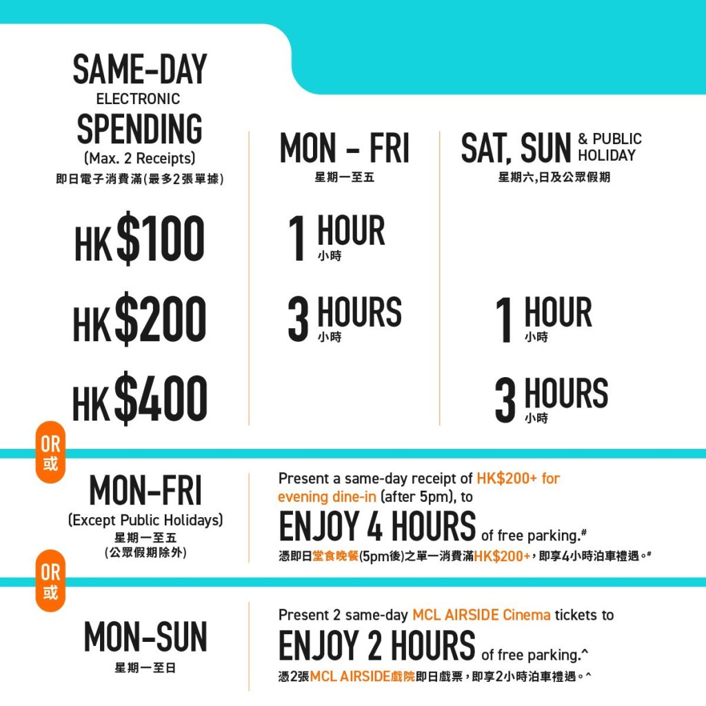 - 免費泊車優惠:在啟德AIRSIDE消費並滿足相應條件可享免費泊車優惠。周一至周五(公眾假期除外),憑最多2張不同商戶即日電子貨幣消費收據,消費合計滿$100可免費泊車1小時,滿$200可免費泊車3小時;周六、日及公眾假期,消費合計滿$200可免費泊車1小時,滿$400可免費泊車3小時。此外,周一至周五(公眾假期除外)憑即日下午5時後滿$200的堂食餐飲電子收據,可享4小時泊車優惠;憑MCL AIRSIDE戲院即日戲票2張,可享2小時免費泊車;NF Touch會員還可額外享1小時免費泊車優惠。優惠適用時間為上午7時至下午11時59分,換領地點在AIRSIDE G/F或2/F禮賓部。