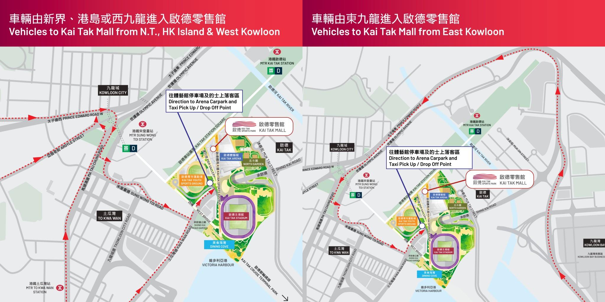 港鐵屯馬綫的啟德站和宋皇臺站為前往啟德體育園提供了便利。若前往啟德體藝館,從啟德站D出口出站最為快捷,出站後直行約5-10分鐘即可到達;若要去啟德主場館及啟德青年運動場,在宋皇臺站D出口出站,右轉步行5-10分鐘就能抵達。這兩個站點周邊標識清晰,出站後沿着指示牌就能輕鬆找到前往各個場所的路線。