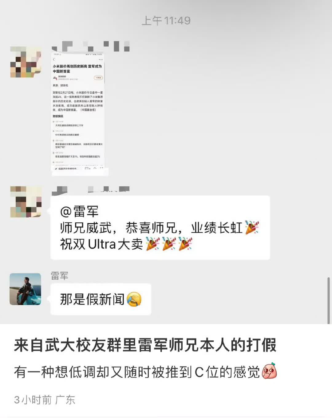 之後,有網友發布疑似雷軍在武大校友群的回應,稱該則消息為「假新聞」。另據彭博實時億萬富豪榜,目前鍾睒睒位列第24位,雷軍位列第31位。