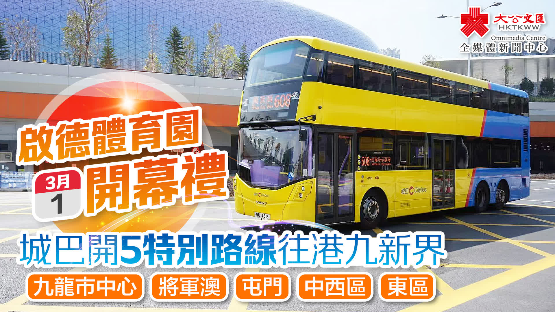 大公文匯全媒體報道,為配合啟德體育園本周六(3月1日)開幕禮,城巴宣布將開辦5條特別路線,前往九龍市中心、將軍澳、屯門、中西區及東區,特別路線更將連接城巴主要巴士轉乘站並提供轉乘優惠,包括屯門公路、將軍澳隧道及香港島等。