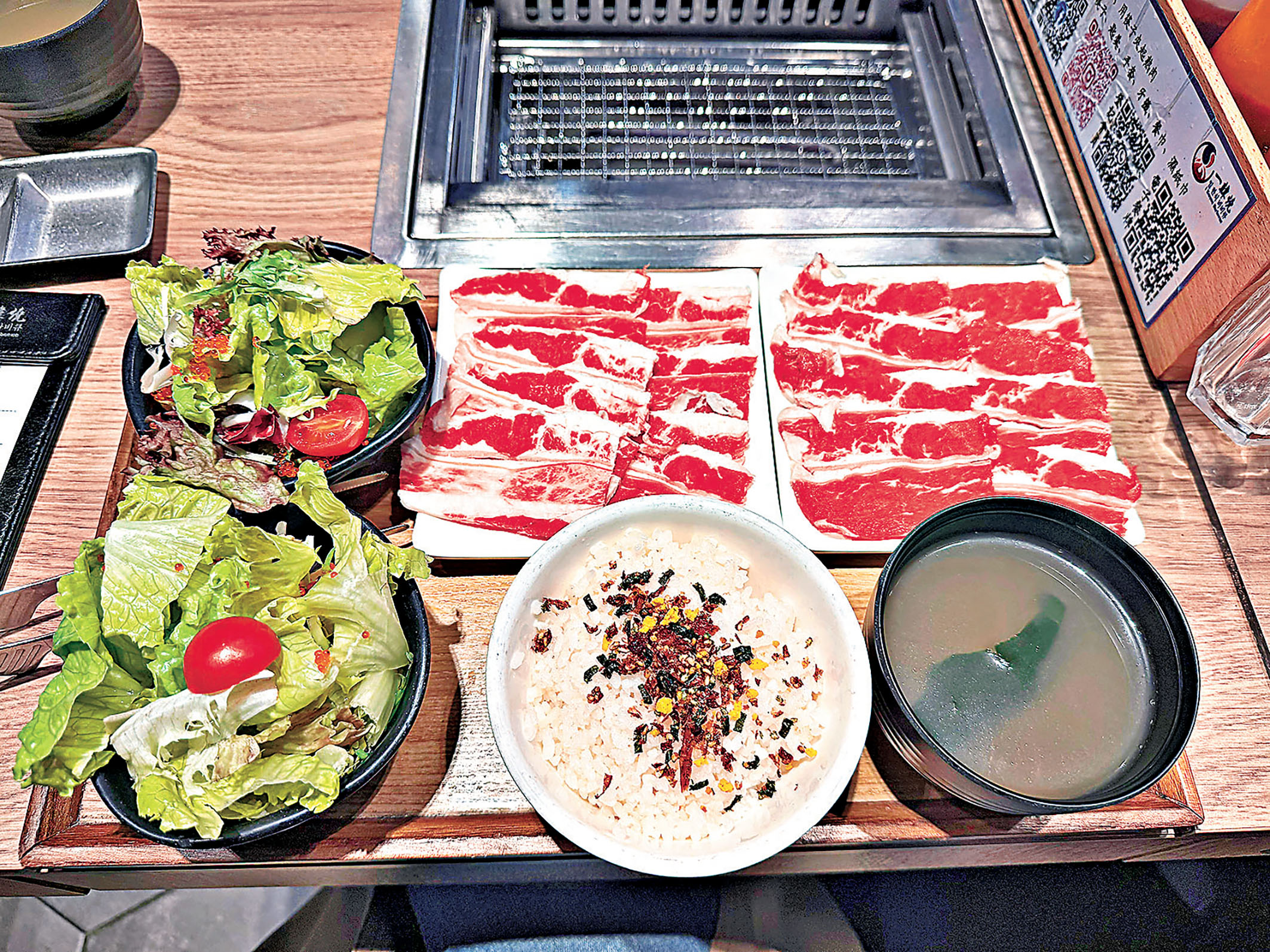 肉類則有黑毛豬五花、牛五花、牛橫膈膜等多種選擇。雖然是平價時段,但肉質非常新鮮,尤其豬五花油脂豐潤,烤至微焦後包裹生菜入口,鹹香與清爽交織。超高性價比吸引不少周邊學生與上班族,也適合在參與體育園活動前後快速飽餐。