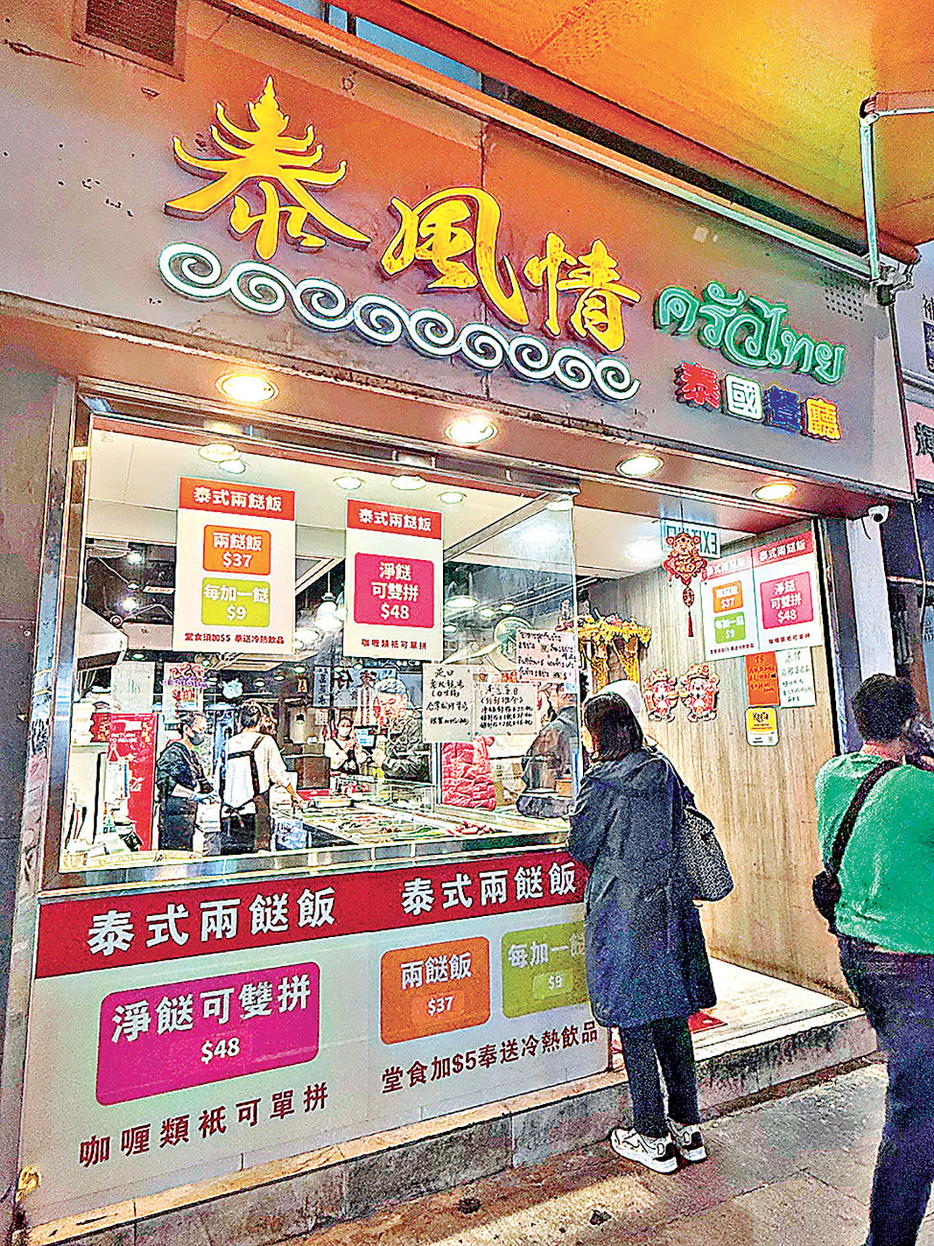 人均不到50元去哪品嘗異國風味?九龍城的「泰風情」以37元的「泰式兩餸飯」征服食客味蕾。自選兩款泰式小菜,如燒豬頸肉、青咖喱雞、辣椒膏炒蜆等等,搭配泰國香米,小菜分量足且調味正宗,酸甜辣香一次滿足。店面雖小但翻桌率高,加5元即可堂食,不過大多食客會選擇外帶,參加活動的遊客也可以選擇外帶至附近公園享用,經濟實惠又充滿異國情調。